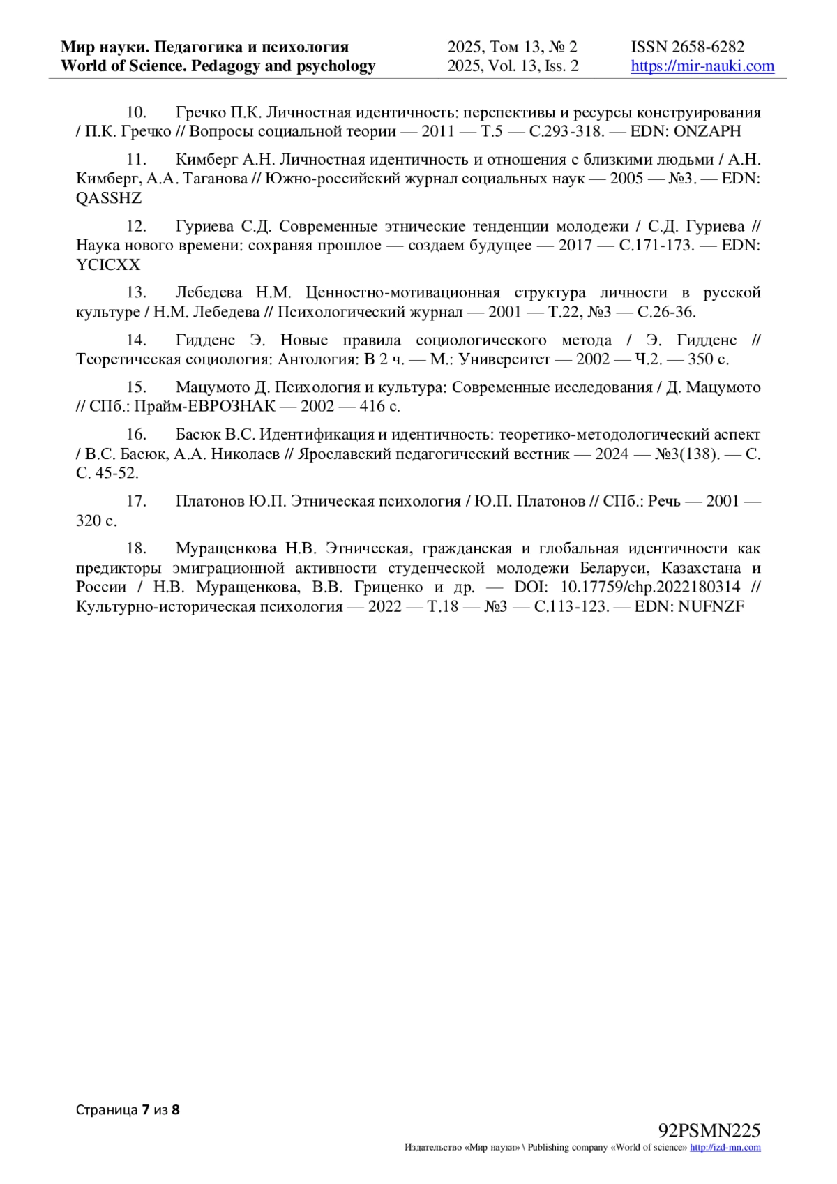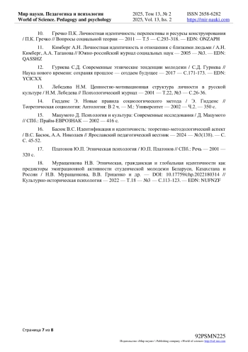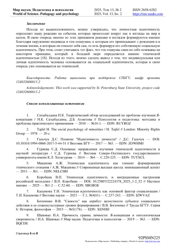 7. Касымова Т.И. Этническая идентичность как основной фактор социализации / Т.И. Касымова // Вестник науки - 2023 - Т. 1, № 4(61) - С. 237-242. -. EDN: IZWVAZ