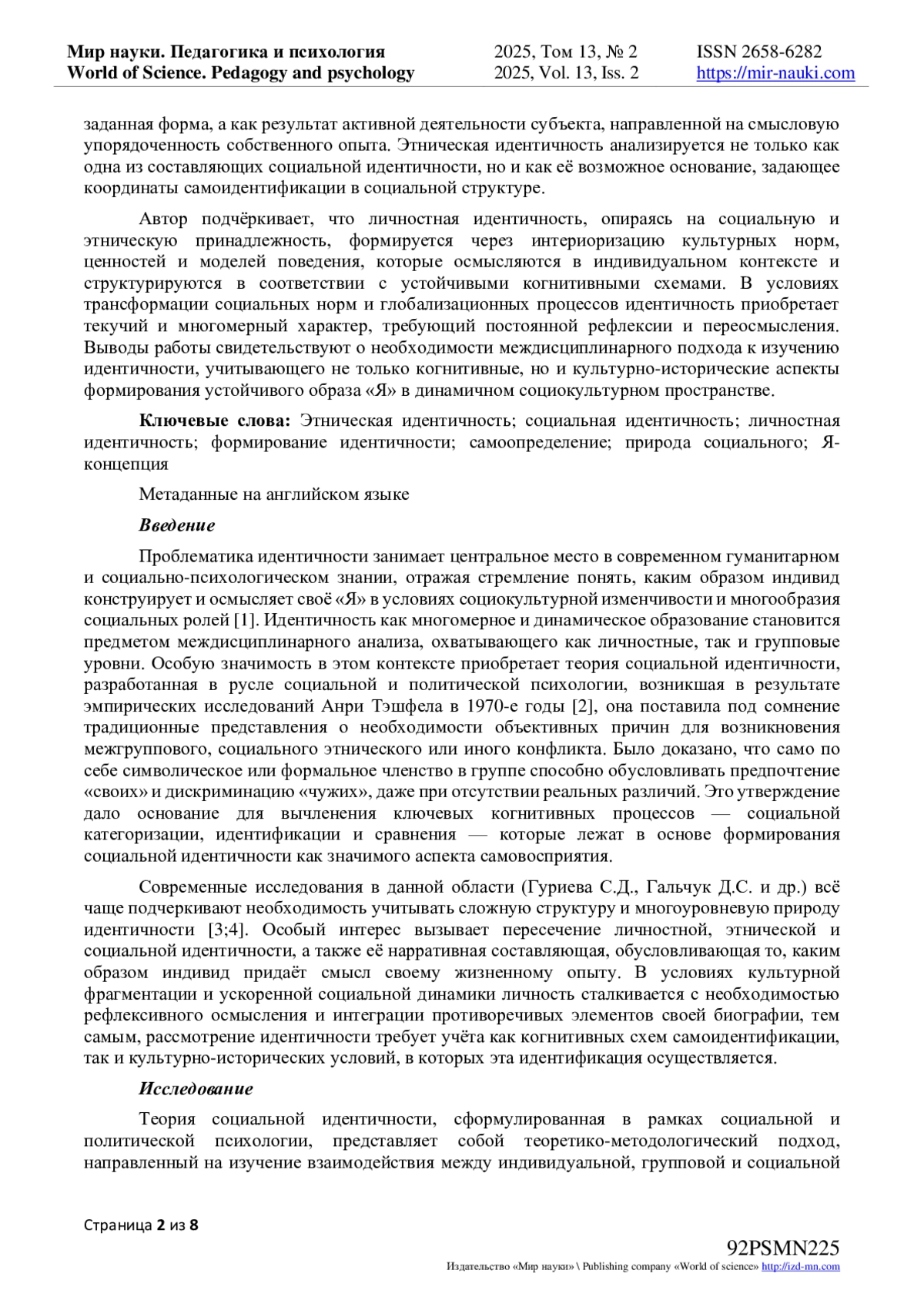 Автор подчёркивает, что личностная идентичность, опираясь на социальную и этническую принадлежность, формируется через интериоризацию культурных норм, ценностей и моделей поведения, которые осмысляются в индивидуальном контексте и структурируются в соответствии с устойчивыми когнитивными схемами. В условиях трансформации социальных норм и глобализационных процессов идентичность приобретает текучий и многомерный характер, требующий постоянной рефлексии и переосмысления.