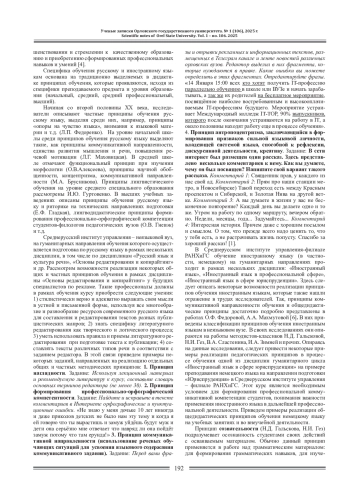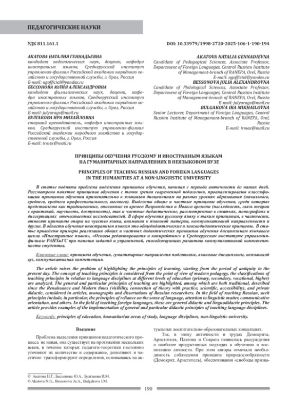 В статье поднята проблема выделения принципов обучения, начиная с периода античности до наших дней. Рассмотрено понятие принципов обучения с точки зрения современной педагогики, проанализированы классификации принципов обучения применительно к языковым дисциплинам на разных уровнях образования (начального, среднего, среднего профессионального, высшего). Выделены общие и частные принципы обучения, среди которых представлены как традиционные, описанные со времен Возрождения и Нового времени (наглядность, связь теории с практикой, научность, доступность), так и частные дидактические, рассмотренные в статьях, монографиях и диссертациях отечественных исследователей. В сфере обучения русскому языку к таким принципам, в частности, относят принципы опоры на чувство языка, внимания к языковой материи, коммуникативной направленности и другие. В области обучения иностранным языкам это общедидактические и лингводидактические принципы. В статье приведены примеры реализации общих и частных дидактических принципов обучения дисциплинам языкового цикла «Иностранные языки», «Основы редактирования и копирайтинг» в Среднерусском институте управления-филиале РАНХиГС при помощи заданий и упражнений, способствующих развитию коммуникативной компетентности студентов.