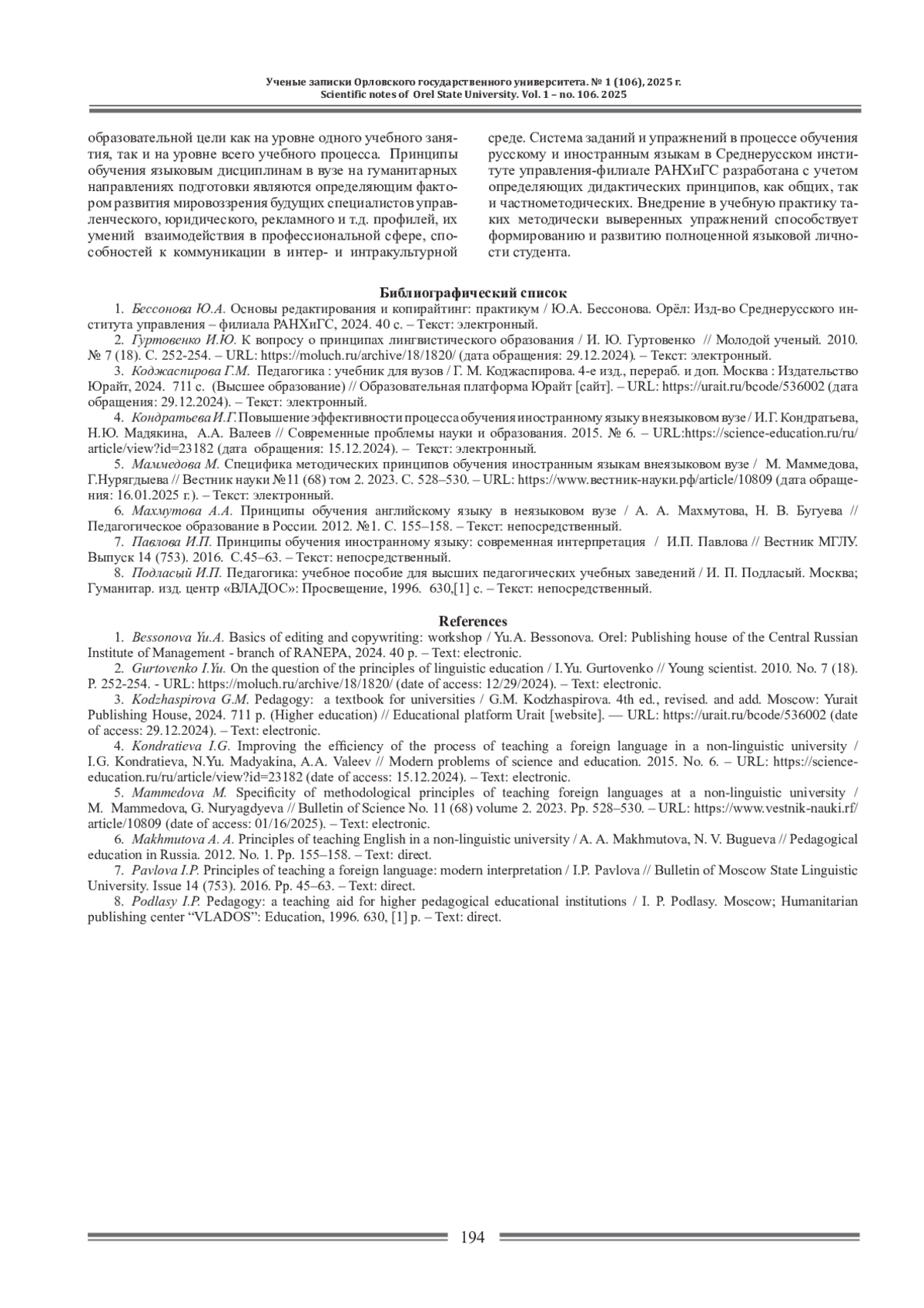 6. Махмутова А.А. Принципы обучения английскому языку в неязыковом вузе / А. А. Махмутова, Н. В. Бугуева // Педагогическое образование в России. 2012. №1. С. 155-158. - Текст: непосредственный.