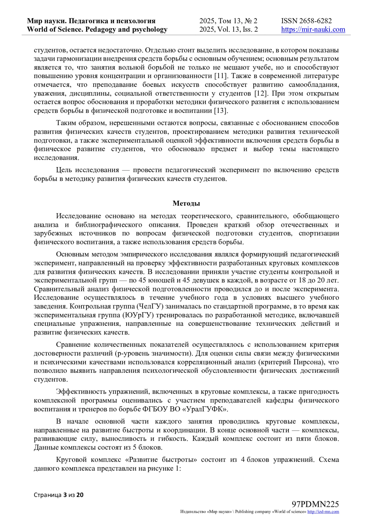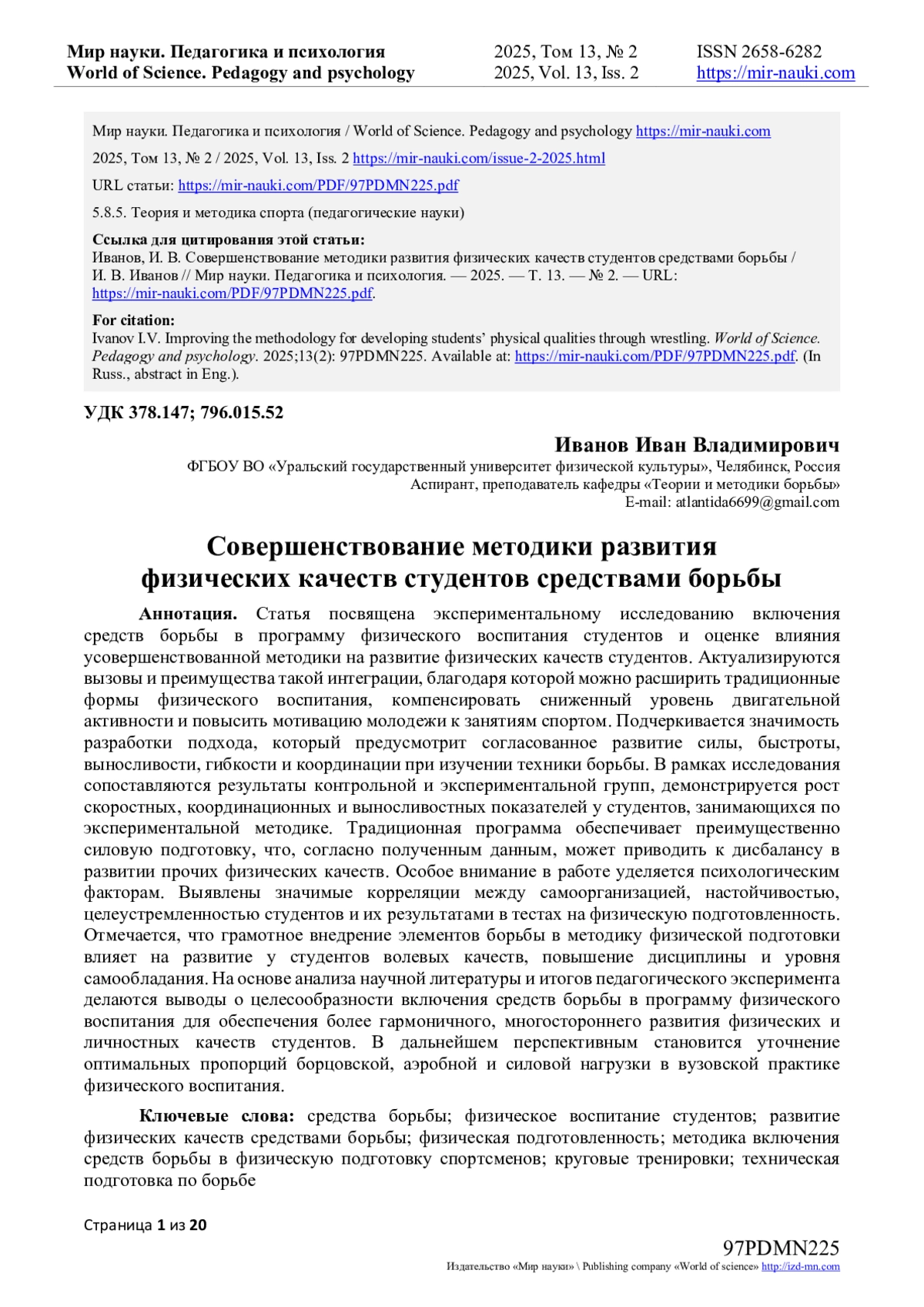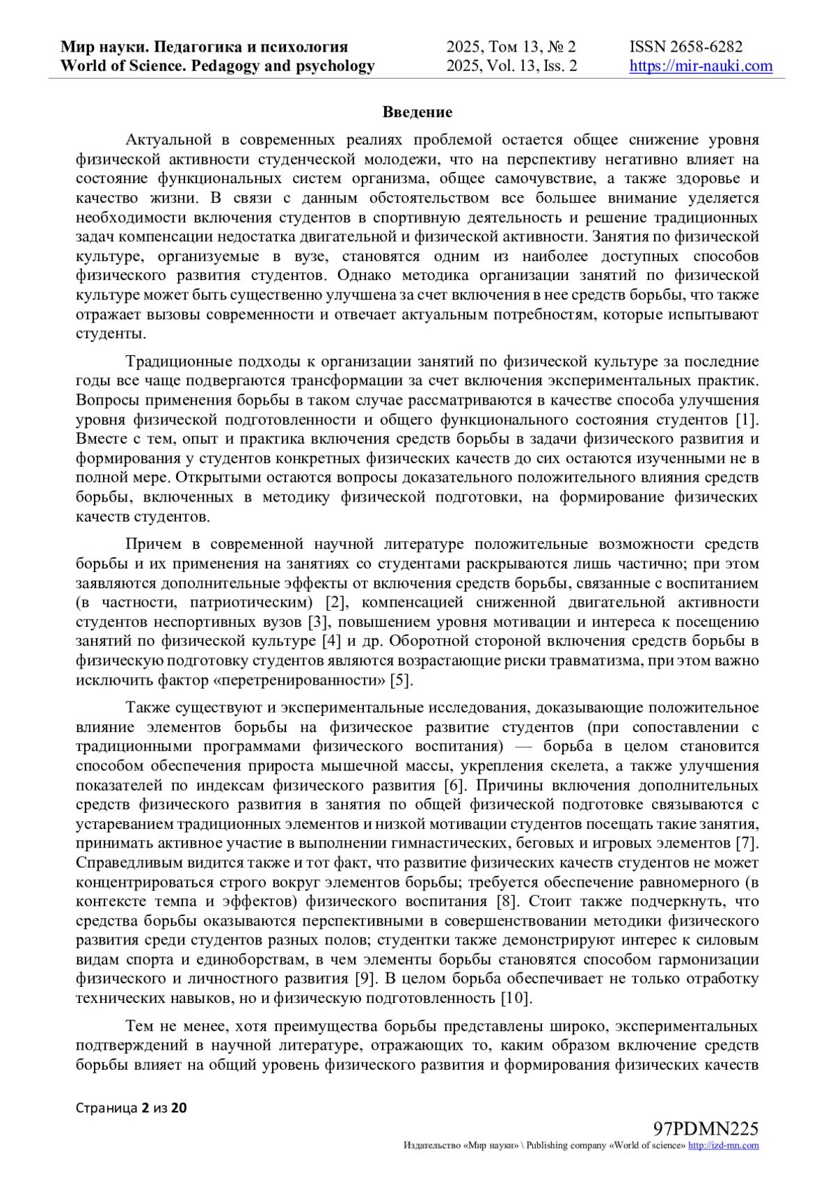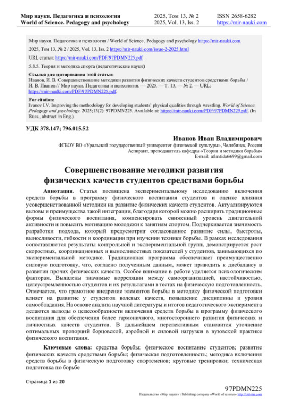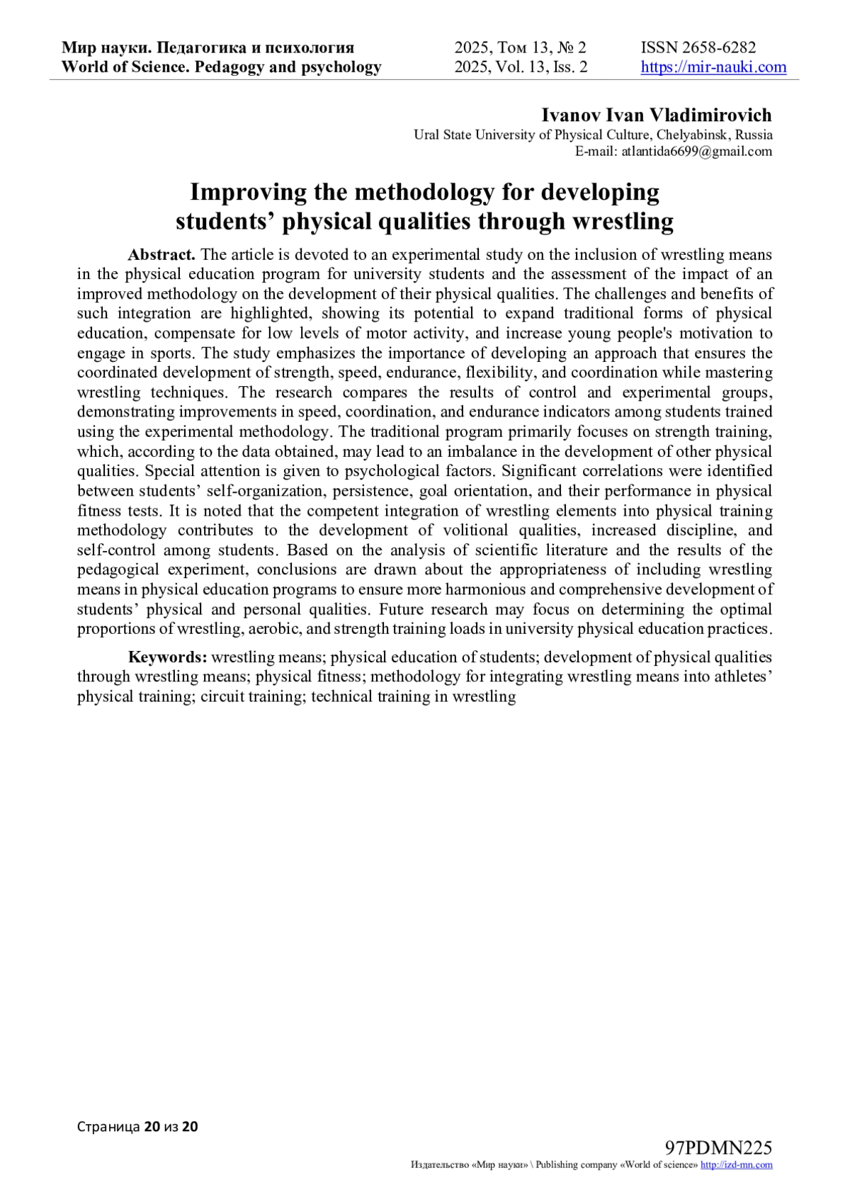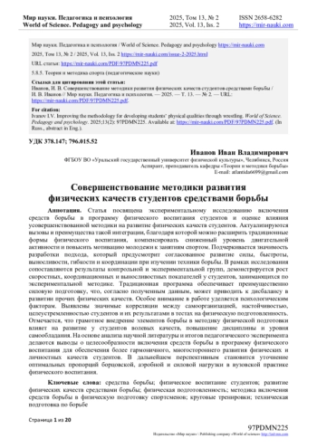 Статья посвящена экспериментальному исследованию включения средств борьбы в программу физического воспитания студентов и оценке влияния усовершенствованной методики на развитие физических качеств студентов. Актуализируются вызовы и преимущества такой интеграции, благодаря которой можно расширить традиционные формы физического воспитания, компенсировать сниженный уровень двигательной активности и повысить мотивацию молодежи к занятиям спортом. Подчеркивается значимость разработки подхода, который предусмотрит согласованное развитие силы, быстроты, выносливости, гибкости и координации при изучении техники борьбы. В рамках исследования сопоставляются результаты контрольной и экспериментальной групп, демонстрируется рост скоростных, координационных и выносливых показателей у студентов, занимающихся по экспериментальной методике. Традиционная программа обеспечивает преимущественно силовую подготовку, что, согласно полученным данным, может приводить к дисбалансу в развитии прочих физических качеств. Особое внимание в работе уделяется психологическим факторам. Выявлены значимые корреляции между самоорганизацией, настойчивостью, целеустремленностью студентов и их результатами в тестах на физическую подготовленность. Отмечается, что грамотное внедрение элементов борьбы в методику физической подготовки влияет на развитие у студентов волевых качеств, повышение дисциплины и уровня самообладания. На основе анализа научной литературы и итогов педагогического эксперимента делаются выводы о целесообразности включения средств борьбы в программу физического воспитания для обеспечения более гармоничного, многостороннего развития физических и личностных качеств студентов. В дальнейшем перспективным становится уточнение оптимальных пропорций борцовской, аэробной и силовой нагрузки в вузовской практике физического воспитания.