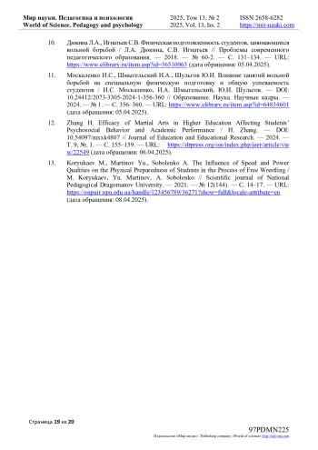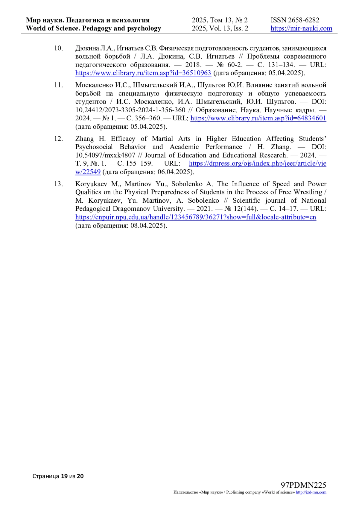 13. Koryukaev M., Martinov Yu., Sobolenko A. The Influence of Speed and Power Qualities on the Physical Preparedness of Students in the Process of Free Wrestling / M. Koryukaev, Yu. Martinov, A. Sobolenko // Scientific journal of National Pedagogical Dragomanov University. - 2021. - № 12(144). - С. 14-17. - URL: https://enpuir.npu.edu.ua/handle/123456789/36271?show=full&locale-attribute=en (дата обращения: 08.04.2025).