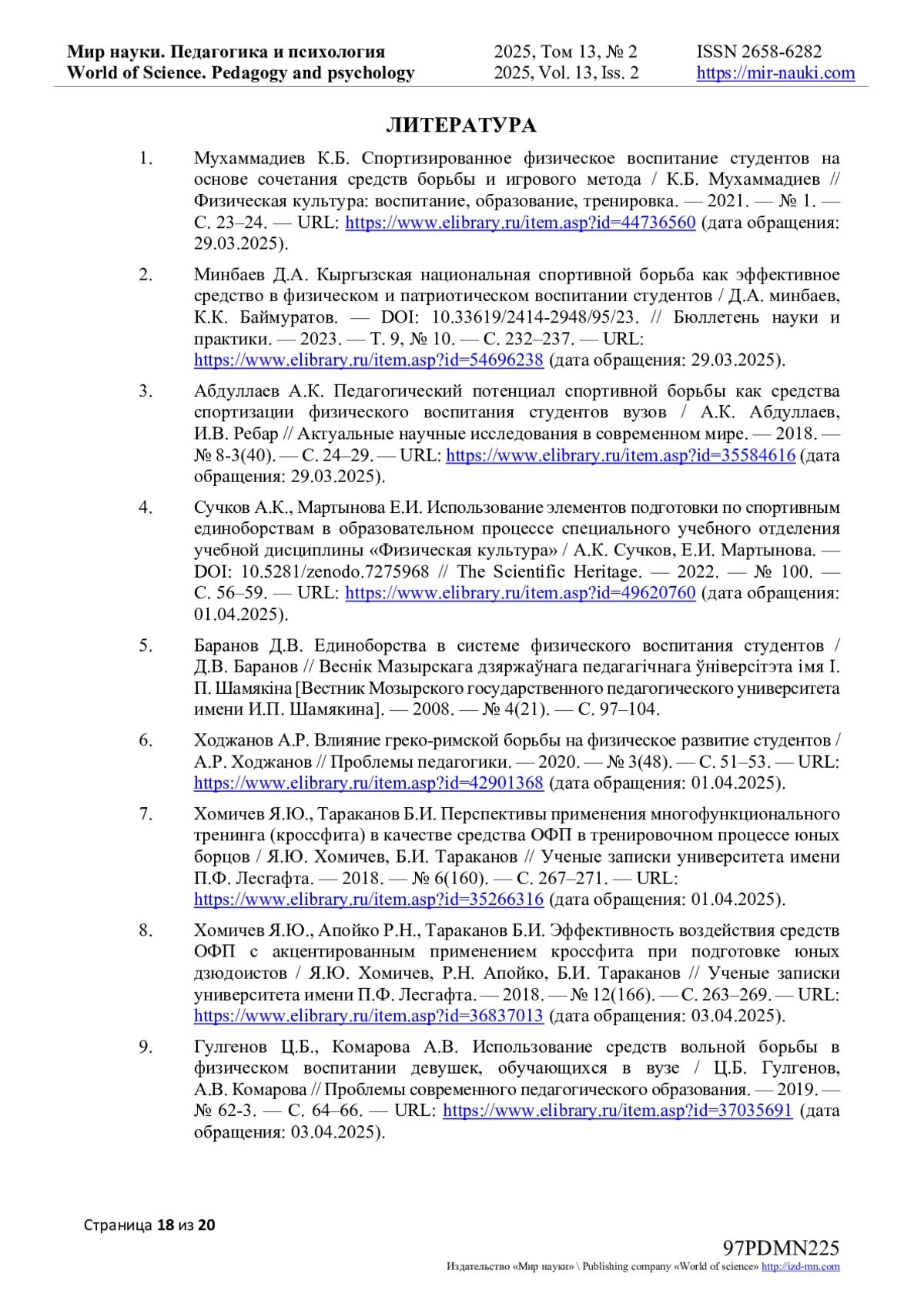 6. Ходжанов А.Р. Влияние греко-римской борьбы на физическое развитие студентов / А.Р. Ходжанов // Проблемы педагогики. - 2020. - № 3(48). - С. 51-53. - URL: item.asp?id=42901368 (дата обращения: 01.04.2025). EDN: PTOCVG