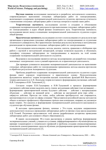 В исследовании использовались методы анализа, синтеза, сравнения и обобщения при работе с научной и методической литературой, которые позволили выделить и обосновать специфику стендовых лабораторных по электродинамике и выделить на этой основе содержание экспериментальной деятельности студентов. Ведущими являются методы моделирования, применяемые при создании методики проведения стендовых лабораторных работ. Предложенная методика будет полезна при организации цифрового обучения студентов технического университета при обучении их общей физике.