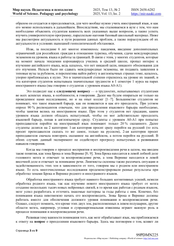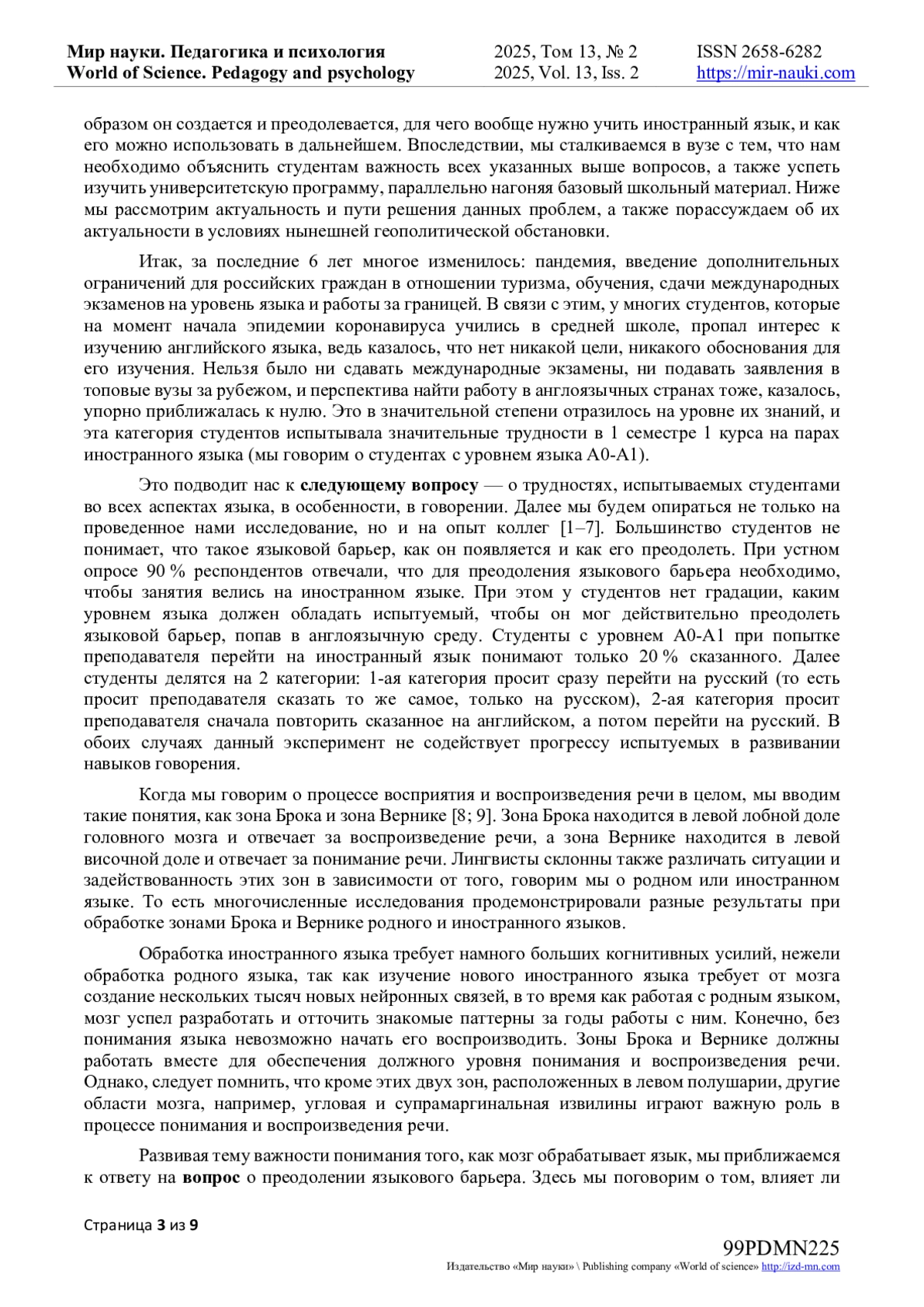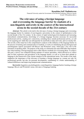 Данная статья посвящена актуальности использования иностранного языка и преодоления языкового барьера студентами неязыковых вузов в условиях глобализации во второй декаде 21 века. В условиях стремительного развития технологий и увеличения межкультурных коммуникаций знание иностранного языка становится необходимым для ведения успешной профессиональной деятельности, создания новых связей, в том числе за пределами профессиональной деятельности, а также для получения новых навыков, которые впоследствии могут быть использованы как в учебе и работе, так и в повседневной жизни. Новизна исследования заключается в комплексном анализе влияния языкового барьера на процесс обучения и коммуникации студентов, а также в выявлении психологических и нейролингвистических аспектов, связанных с зонами Брока и Вернике, которые играют ключевую роль в формировании навыков говорения.