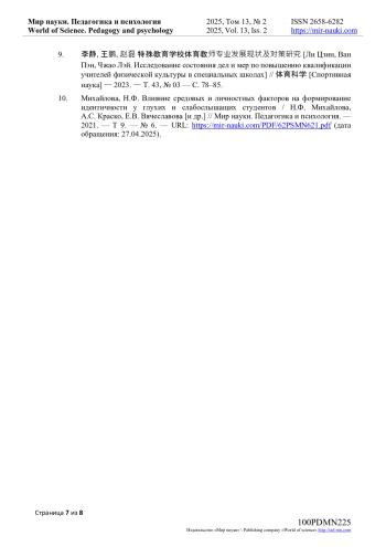 10. Михайлова, Н.Ф. Влияние средовых и личностных факторов на формирование идентичности у глухих и слабослышащих студентов / Н.Ф. Михайлова, А.С. Краско, Е.В. Вячеславова [и др.] // Мир науки. Педагогика и психология. - 2021. - Т 9. - № 6. - URL: https://mir-nauki.com/PDF/62PSMN621.pdf (дата обращения: 27.04.2025). EDN: KEDCCE