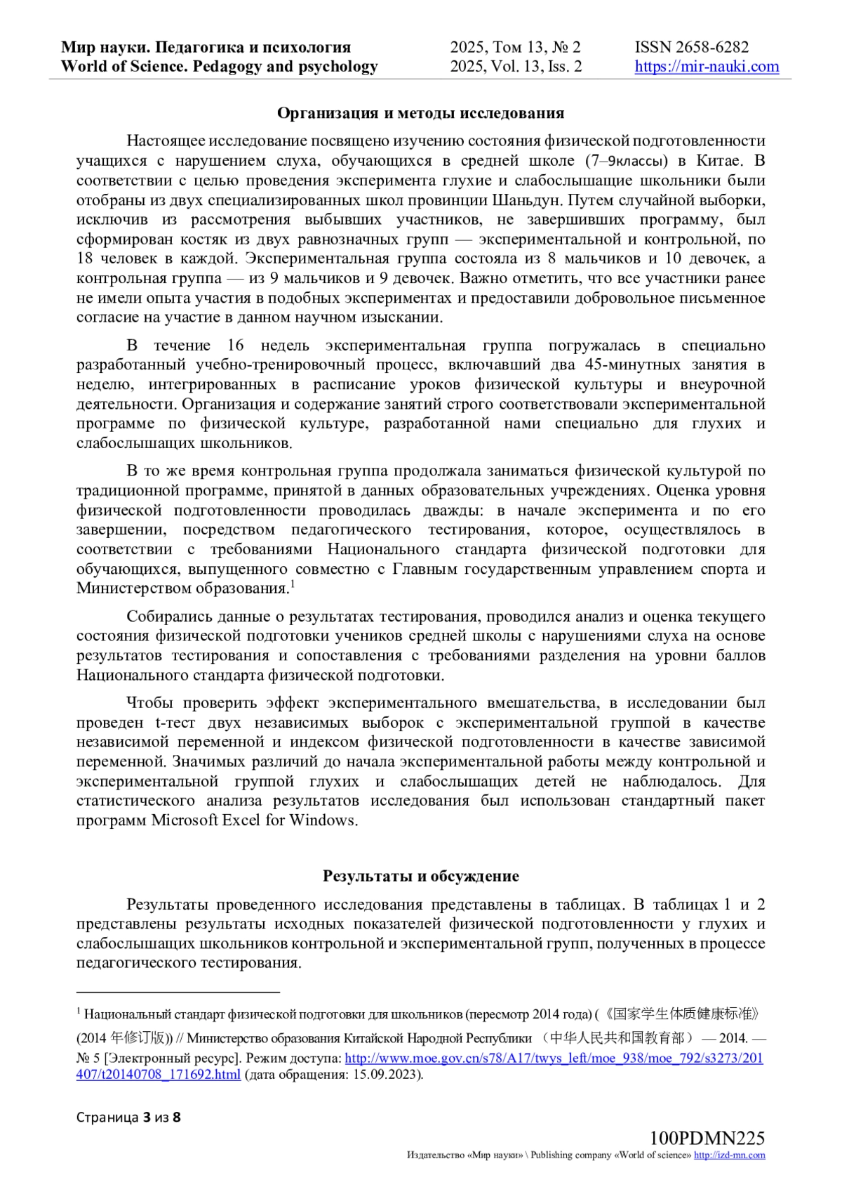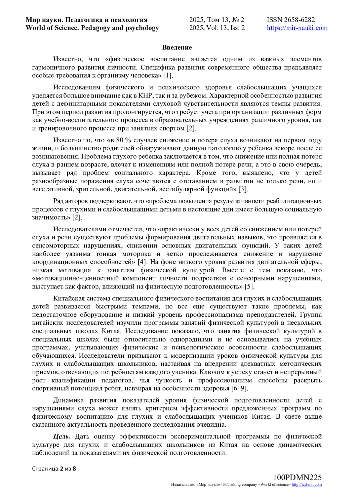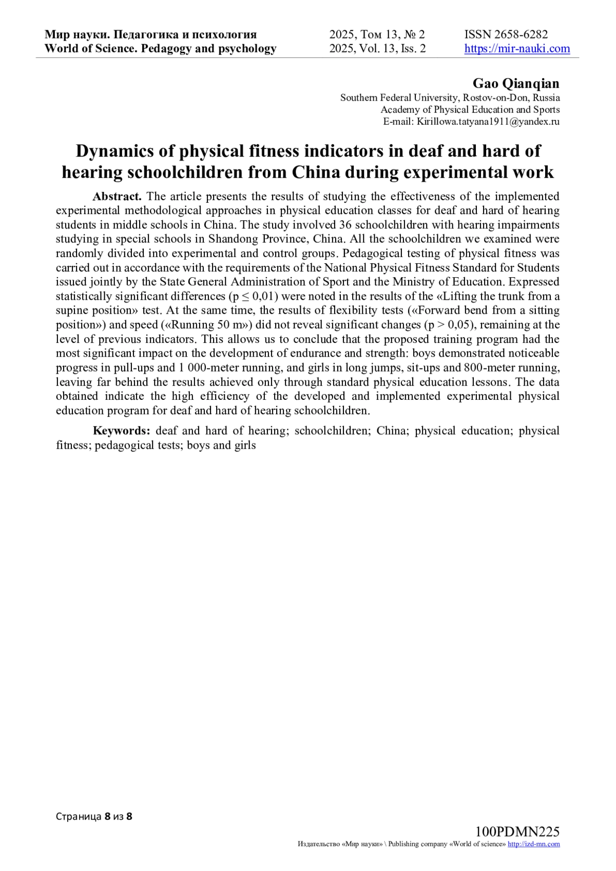 В статье представлены результаты изучения эффективности внедренных экспериментальных методических подходов в занятия физической культурой для глухих и слабослышащих учащихся средней школы Китая. В исследовании приняли участие 36 школьников с нарушениями в слуховой системе, обучающихся в специальных школах Китая провинции Шаньдун. Случайным образом все обследованные нами школьники были разделены на экспериментальную и контрольную группы. Педагогическое тестирование физической подготовленности осуществлялось в соответствии с требованиями Национального стандарта физической подготовки для обучающихся, выпущенного совместно с Главным государственным управлением спорта и Министерством образования. Выраженные статистически значимые различия (p ≤ 0,01) отмечались в результатах теста «Поднимание туловища из положения лежа на спине». В то же время, результаты тестов на гибкость («Наклон вперед из положения сидя») и скорости («Бег на 50 м») не выявили существенных изменений (p > 0,05), оставшись на уровне прежних показателей. Это позволяет заключить, что предложенная программа тренировок оказала наиболее ощутимое влияние на развитие выносливости и силы: мальчики продемонстрировали заметный прогресс в подтягиваниях и беге на 1 000 метров, а девочки - в прыжках в длину, подъеме туловища из положения лежа и беге на 800 метров, оставив далеко позади результаты, достигнутые лишь посредством стандартных уроков физической культуры. Полученные данные указывают на высокую эффективность разработанной и внедренной экспериментальной программы по физической культуре для глухих и слабослышащих школьников.