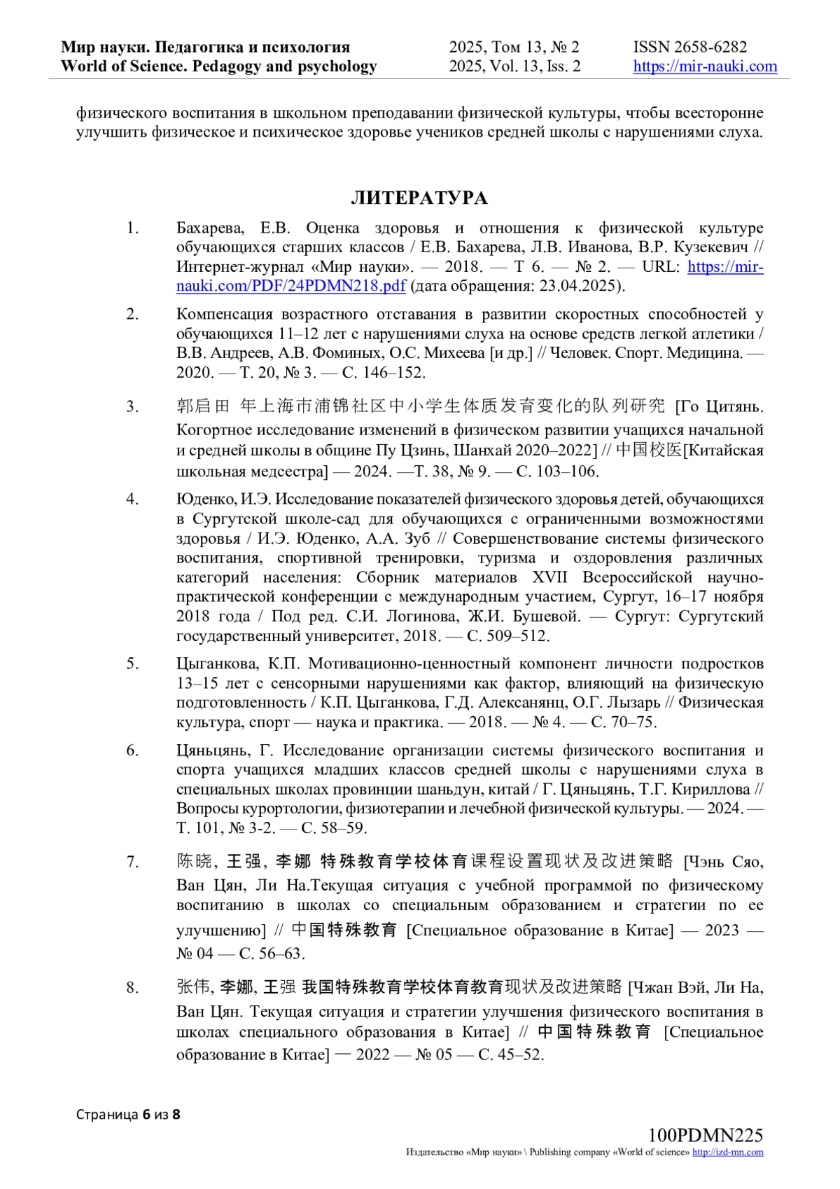 6. Цяньцянь, Г. Исследование организации системы физического воспитания и спорта учащихся младших классов средней школы с нарушениями слуха в специальных школах провинции шаньдун, китай / Г. Цяньцянь, Т.Г. Кириллова // Вопросы курортологии, физиотерапии и лечебной физической культуры. - 2024. - Т. 101, № 3-2. - С. 58-59. EDN: VKMJTV