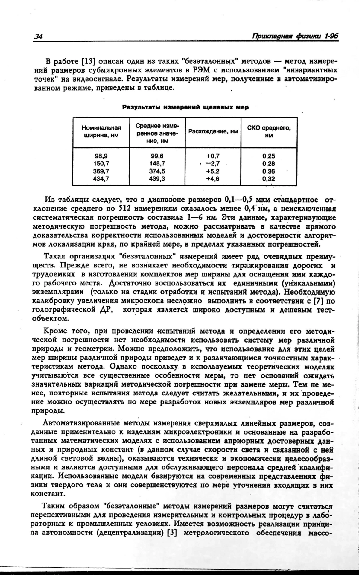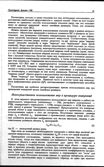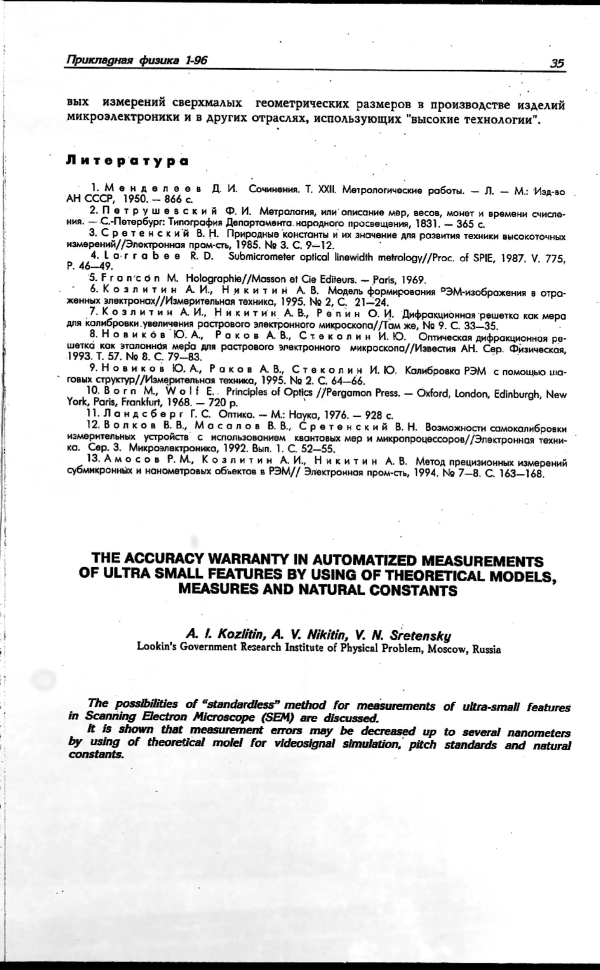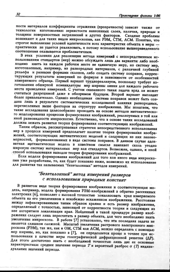 Обсуждаются возможности “безэталонных” методов измерений сверхмалых размеров в растровом электронном микроскопе (РЭМ). Показано, что при использовании теоретических моделей формирования видеосигнала, мер периода и природных констант удается снизить погрешности измерений до нескольких нанометров