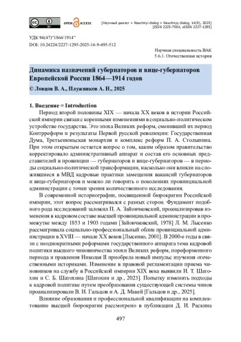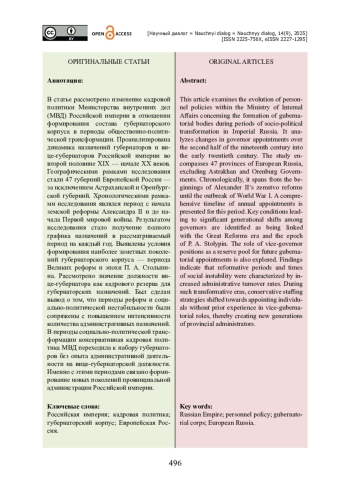 В статье рассмотрено изменение кадровой политики Министерства внутренних дел (МВД) Российской империи в отношении формирования состава губернаторского корпуса в периоды общественно-политической трансформации. Проанализирована динамика назначений губернаторов и вице-губернаторов Российской империи во второй половине XIX — начале XX веков. Географическими рамками исследования стали 47 губерний Европейской России — за исключением Астраханской и Оренбургской губерний. Хронологическими рамками исследования являлся период с начала земской реформы Александра II и до начала Первой мировой войны. Результатом исследования стало получение полного графика назначений в рассматриваемый период на каждый год. Выявлены условия формирования наиболее заметных поколений губернаторского корпуса — периода Великих реформ и эпохи П. А. Столыпина. Рассмотрено значение должности вице-губернатора как кадрового резерва для губернаторских назначений. Был сделан вывод о том, что периоды реформ и социально-политической нестабильности были сопряжены с повышением интенсивности количества административных назначений. В периоды социально-политической трансформации консервативная кадровая политика МВД переходила к набору губернаторов без опыта административной деятельности на вице-губернаторской должности. Именно с этими периодами связано формирование новых поколений провинциальной администрации Российской империи.