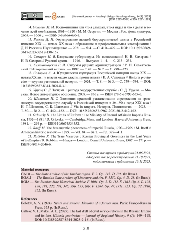 5. Гальцов В. И. Последний проект реформы гражданской службы в Российской империи и его судьба / В. И. Гальцов, А. Д. Макей // Historia provinciae - журнал региональной истории. - 2025. - Т. 9. - № 1. - С. 149-198. - https://doi.org/10.23859/2587-8344-2025-9-1-5.