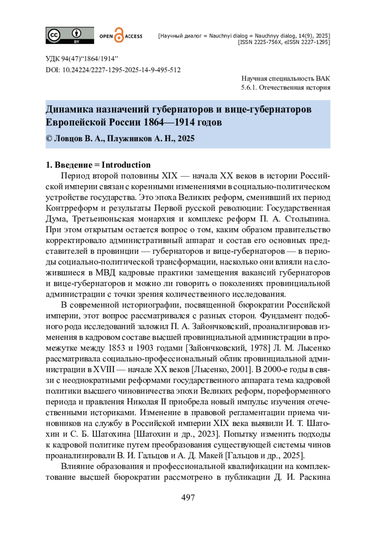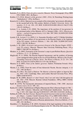 11. Лямин С. К. И. А. Тарасенко-Отрешков и Н. Ю. Шильдер-Шульднер : факторы карьерной неуспешности вице-губернаторов в Российской империи начала XX века / С. К. Лямин, В. А. Ловцов // Вестник архивиста. - 2025. - № 1. - С. 186-203. - https://doi.org/10.28995/2073-0101-2025-1-186-203.