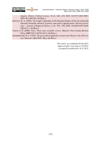 21. Соловьев К. А. Юридическая корпорация Российской империи конца ХIХ - начала ХХ вв. : у власти, около власти, против власти / К. А. Соловьев // Historia provinciae - журнал региональной истории. - 2024. - Т. 8. - № 3. - С. 759-794. - https://doi.org/10.23859/2587-8344-2024-8-3-1.