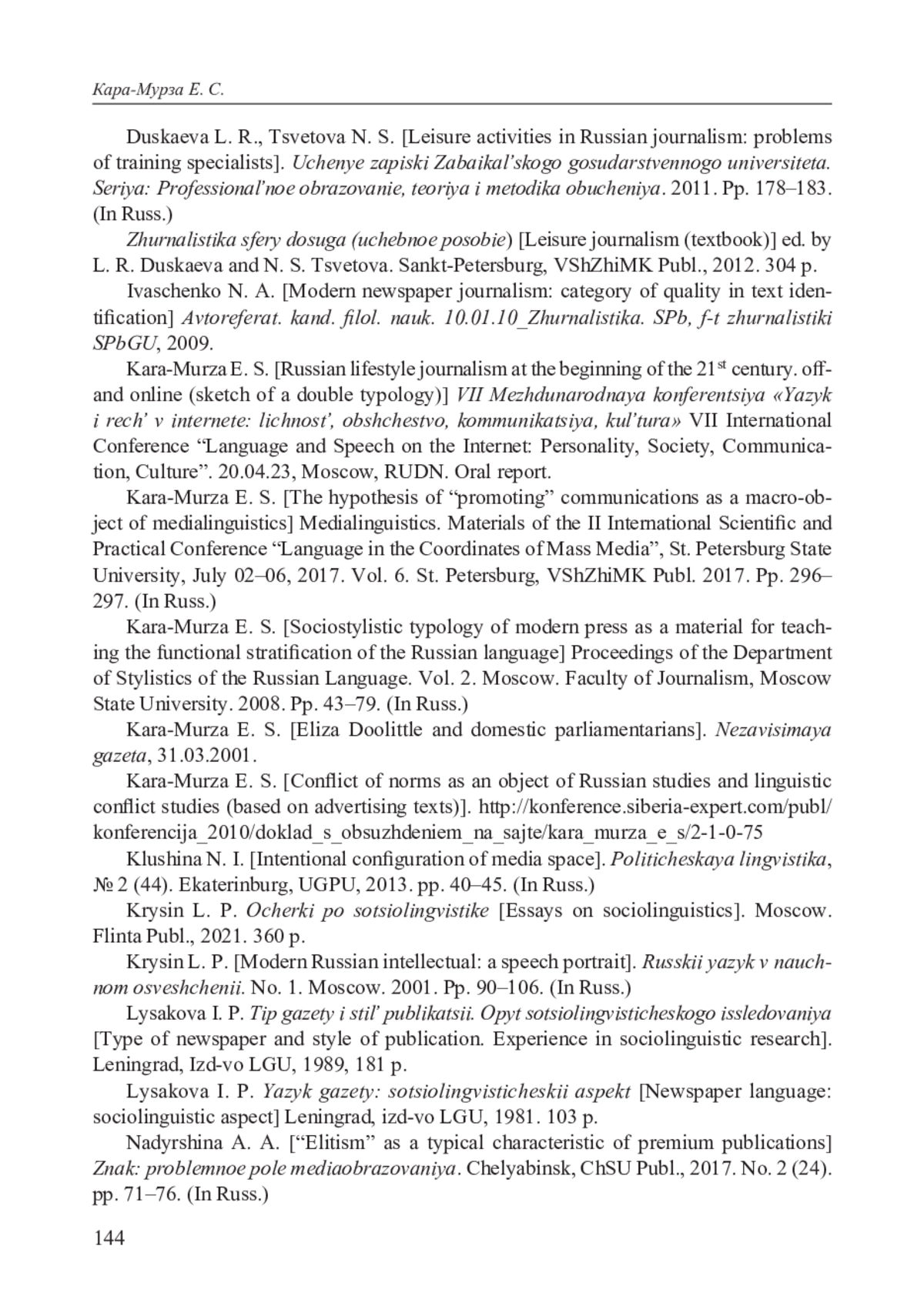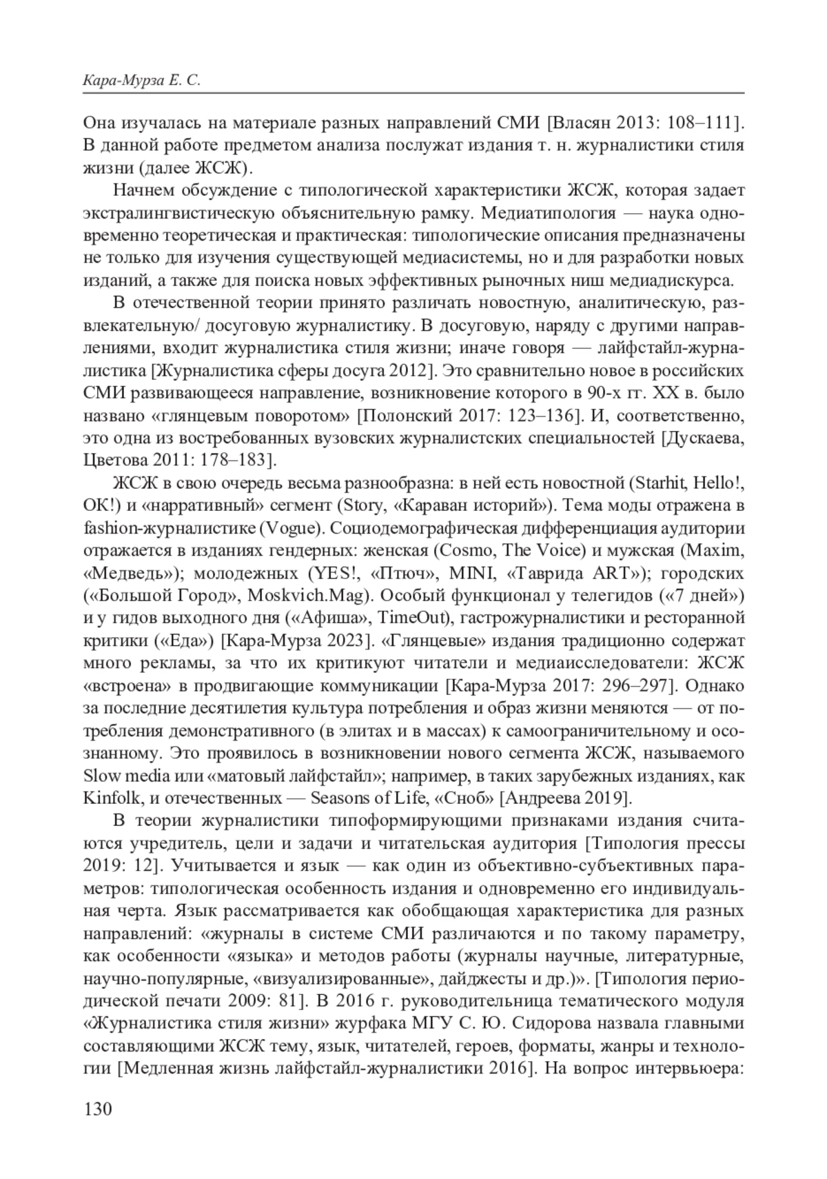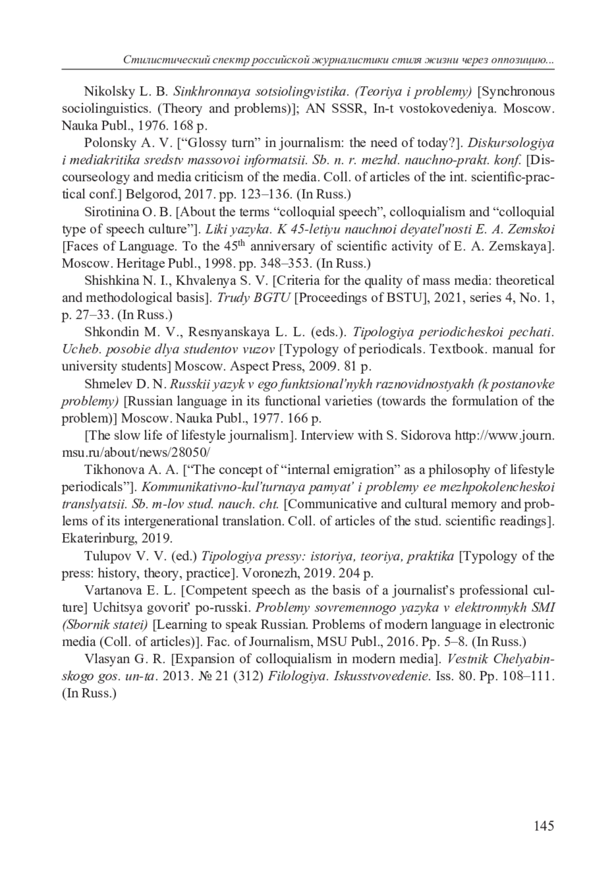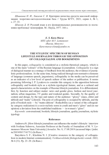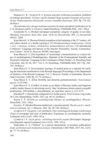 10. Кара-Мурза Е. С. Социостилистическая типология современной печати как материал для преподавания функционального расслоения русского языка// Труды кафедры стилистики русского языка. Вып. 2. М.: ф-т журналистики МГУ, 2008. С. 43-79.