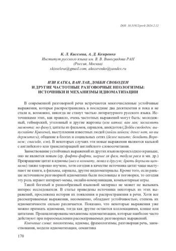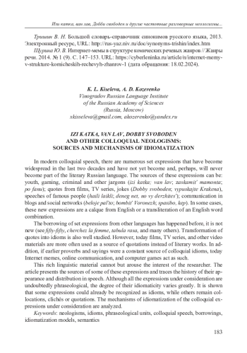 В современной разговорной речи встречаются многочисленные устойчивые выражения, которые распространились в последние два десятилетия и пока и не стали и, возможно, никогда не станут частью литературного русского языка. Источниками этих, как правило, очень частотных выражений могут быть: молодежный, геймерский, уголовный и другие жаргоны (изи катка; ван лав; заскамить мамонта; по фану); цитаты из фильмов, сериалов, анекдотов (Добби свободен; выпускайте Кракена), выступления известных людей (хайли лайкли; денег нет, но вы держитесь); общение в блогах и социальных сетях (белое пальто; бомбить Воронеж; спасибо, кэп). В некоторых случаях эти новые выражения являются калькой с английского или транслитерацией английского словосочетания. Заимствование устойчивых выражений из других языков происходило и раньше, оно не является новым (ср. фифти-фифти, шерше ля фам, табула раса и мн. др.) Превращение цитат в идиомы (шел в комнату, попал в другую; брать борзыми щенками) также хорошо изучено, хотя сегодня в качестве источника цитат чаще выступают не книги, а фильмы, сериалы, другие видеоматериалы. Кроме того, если раньше источником разговорной идиоматики были пословицы и поговорки, то сегодня эту роль играют интернет-мемы, онлайн-коммуникация, компьютерные игры. Такой богатый и разнообразный языковой материал не может не вызывать интерес исследователя. В статье приведены источники некоторых из этих выражений, прослежена история их появления и распространения в речи. Хотя все рассматриваемые выражения, несомненно, обладают устойчивостью, степень их идиоматичности сильно различается. Показано, что некоторые выражения уже можно признать идиомами, тогда как другие остаются коллокациями, клише или цитатами. Проанализированы механизмы идиоматизации, которые наиболее часто действуют при переосмыслении рассматриваемых разговорных выражений.
