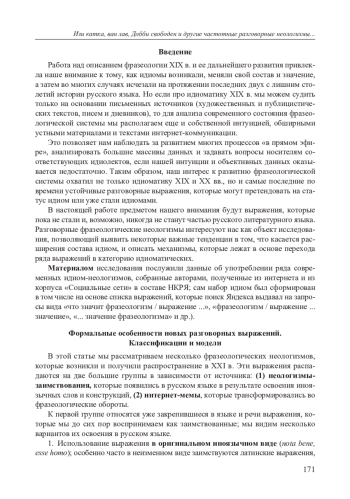 Работа над описанием фразеологии XIX в. и ее дальнейшего развития привлекла наше внимание к тому, как идиомы возникали, меняли свой состав и значение, а затем во многих случаях исчезали на протяжении последних двух с лишним столетий истории русского языка. Но если про идиоматику XIX в. мы можем судить только на основании письменных источников (художественных и публицистических текстов, писем и дневников), то для анализа современного состояния фразеологической системы мы располагаем еще и собственной интуицией, обширными устными материалами и текстами интернет-коммуникации