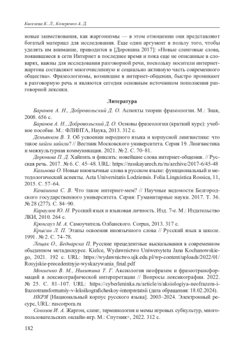 11. Мокиенко В. М., Никитина Т. Г. Аксиология неофразем и фразеотрансформаций в лексикографической интерпретации // Вопросы лексикографии. 2022. № 25. С. 81-107. URL: https://cyberleninka.ru/article/n/aksiologiya-neofrazem-i-frazeotransformatsiy-v-leksikograficheskoy-interpretatsii (дата обращения: 18.02.2024). EDN: LWOTBF