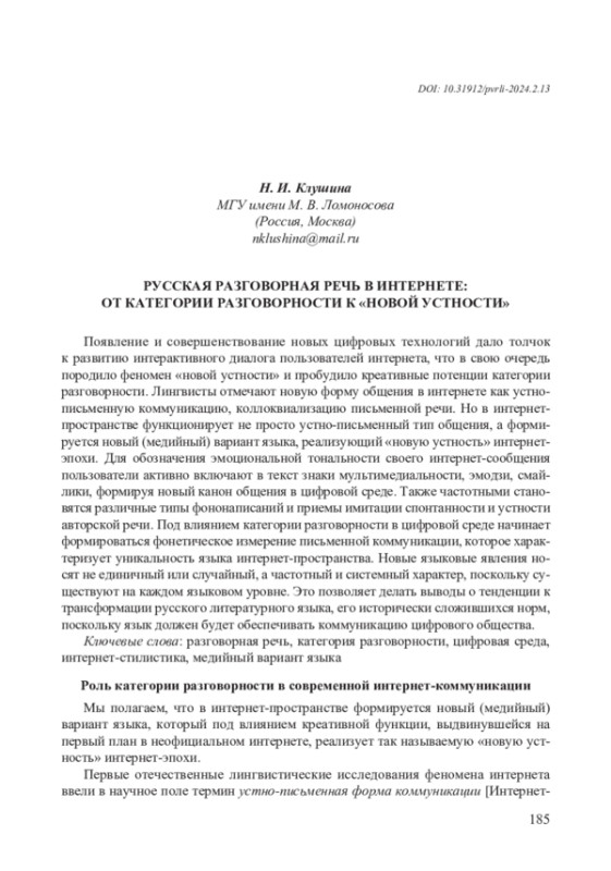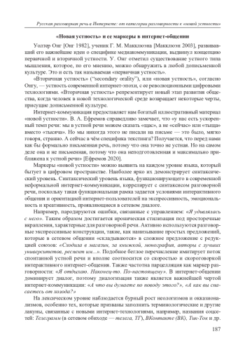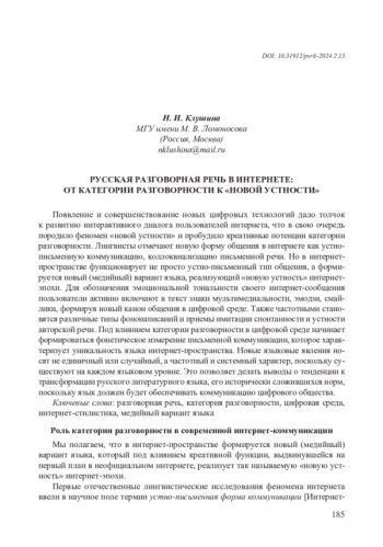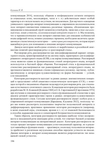 Мы полагаем, что в интернет-пространстве формируется новый (медийный) вариант языка, который под влиянием креативной функции, выдвинувшейся на первый план в неофициальном интернете, реализует так называемую «новую устность» интернет-эпохи. Первые отечественные лингвистические исследования феномена интернета ввели в научное поле термин устно-письменная форма коммуникации [Интернет- 186 коммуникация 2014], поскольку общение в неофициальном сегменте интернета (в социальных сетях, мессенджерах, чатах и т. п.) действительно имеет особый характер и его нельзя назвать ни устным, ни письменным. Для научного освещения уникального характера интернет-коммуникации в современном исследовательском поле интернет-лингвистики появились различные термины, обозначающие проникновение в письменный строй элементов устной речи, такие как устно-письменный язык, новая устность, коллоквиализация интернет-языка и т. п. Мы полагаем, что в терминологическое поле интернет-лингвистики для описания особенностей языка цифровой эпохи, помимо указанных терминов, необходимо включить традиционную стилистическую категорию — категорию разговорности, которая играет важнейшую роль для понимания и описания интернет-коммуникации