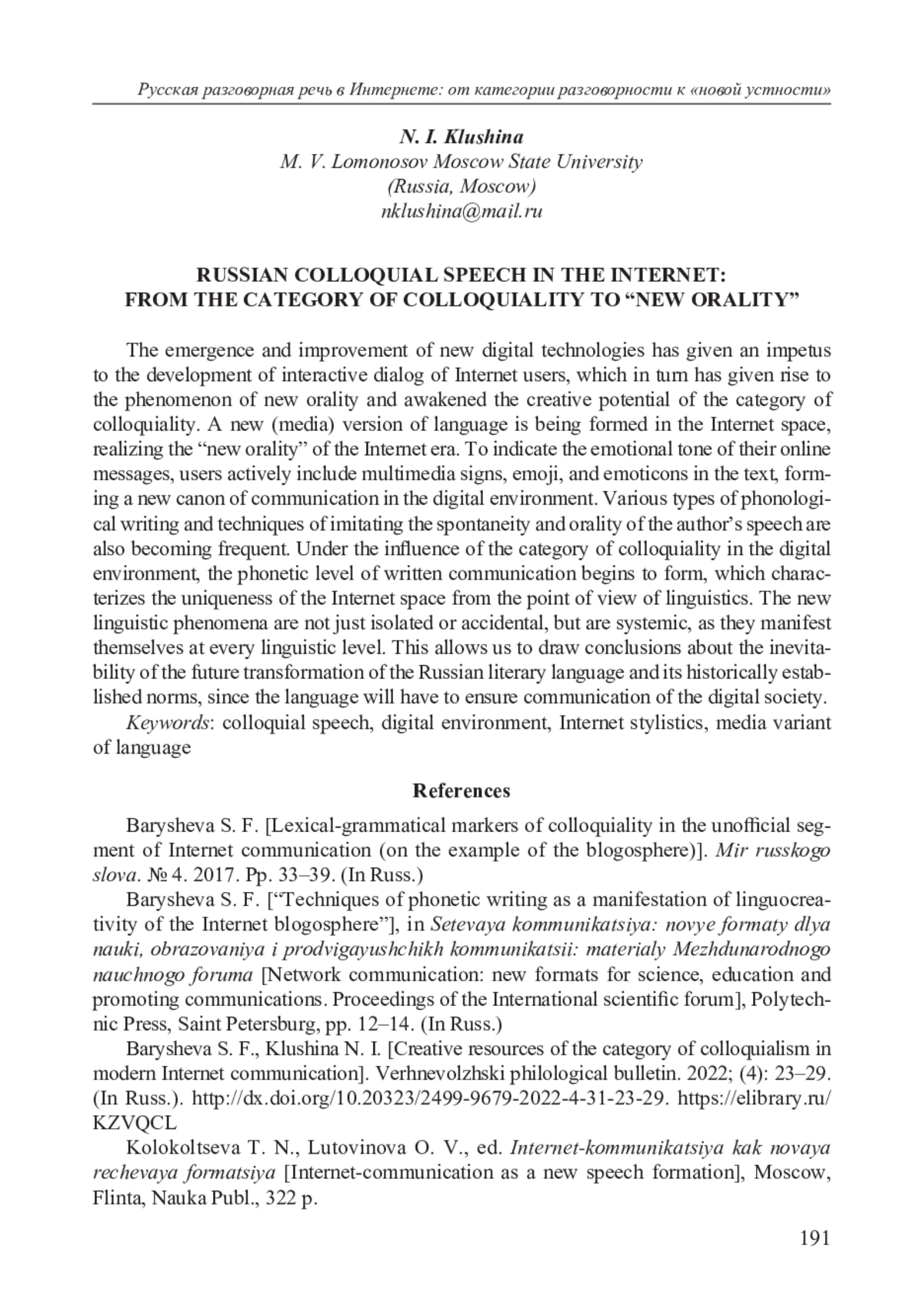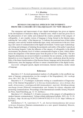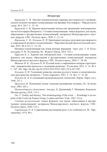 3. Барышева С. Ф., Клушина Н. И. Креативные ресурсы категории разговорности в современной интернет-коммуникации // Верхневолжский филологический вестник. 2022. № 4 (31). С. 23-29. EDN: KZVQCL