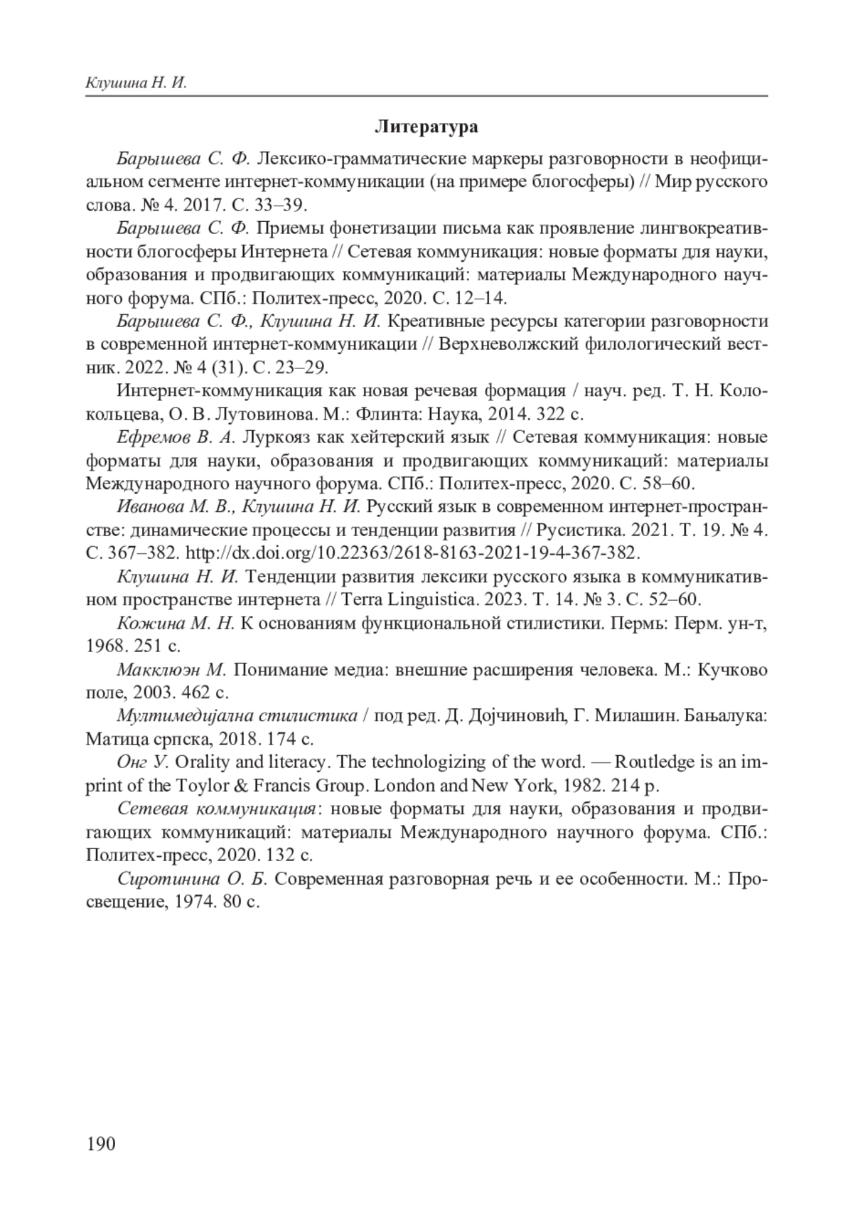 7. Клушина Н. И. Тенденции развития лексики русского языка в коммуникативном пространстве интернета // Terra Linguistica. 2023. Т. 14. № 3. С. 52-60. EDN: DTBSSL