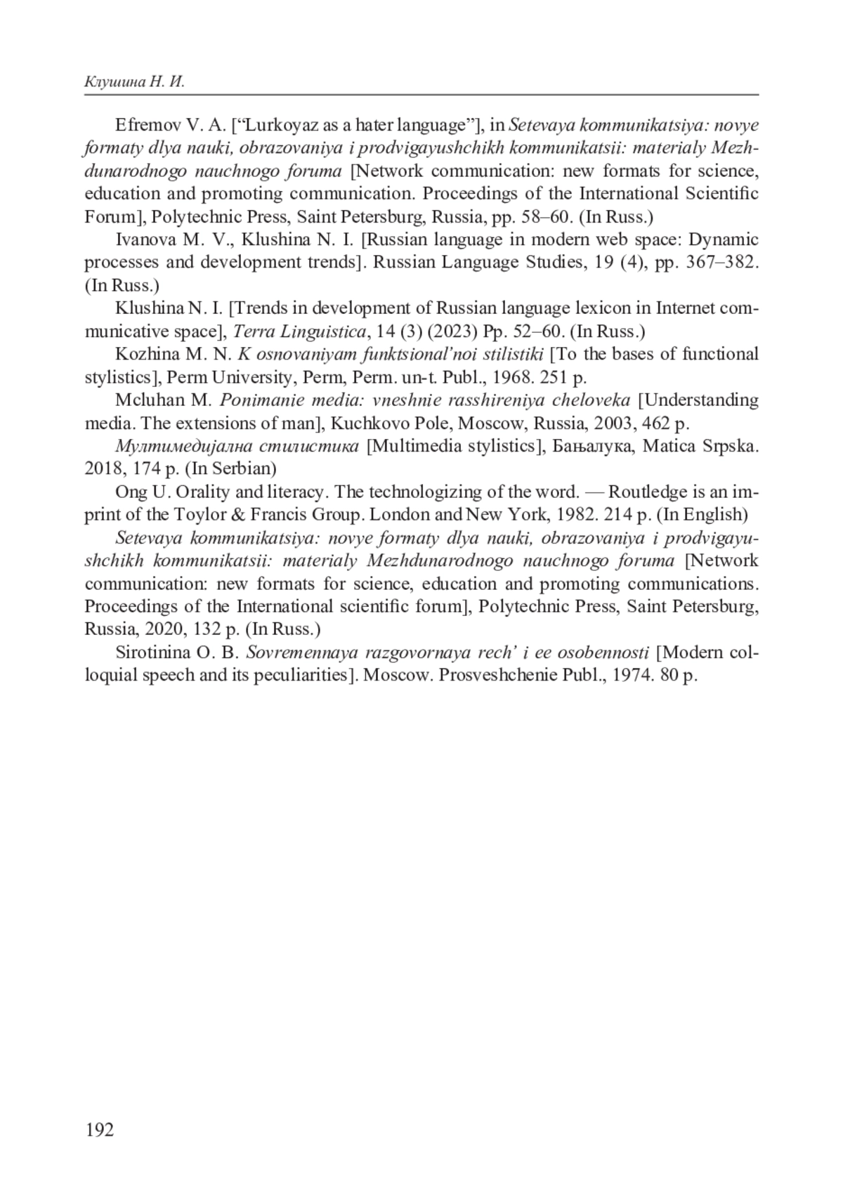 6. Иванова М. В., Клушина Н. И. Русский язык в современном интернет-пространстве: динамические процессы и тенденции развития // Русистика. 2021. Т. 19. № 4. С. 367-382. DOI: 10.22363/2618-8163-2021-19-4-367-382 EDN: FYERZY