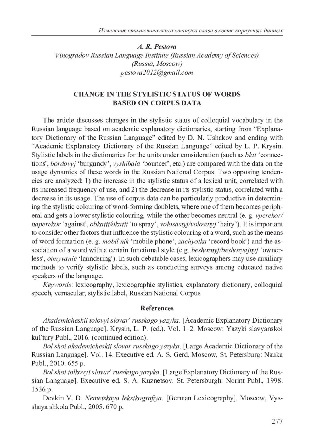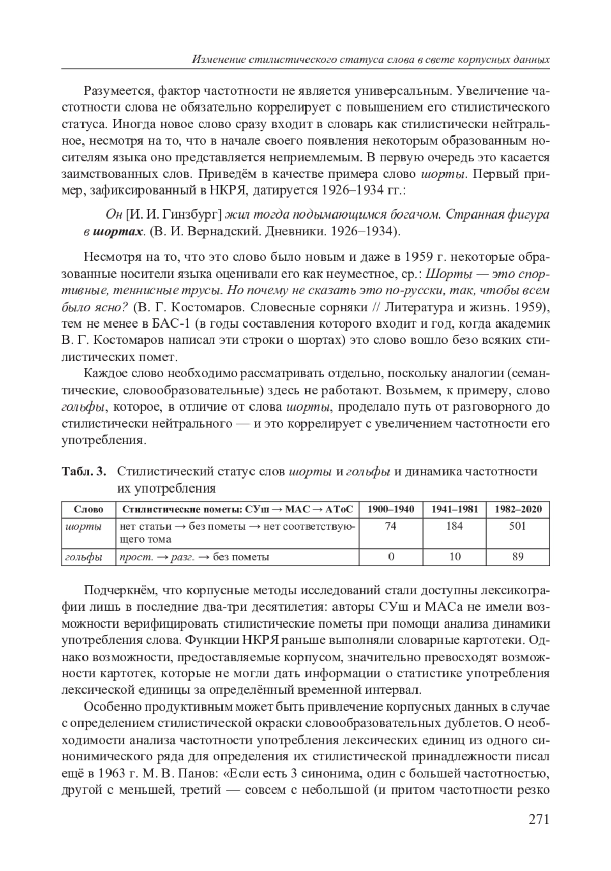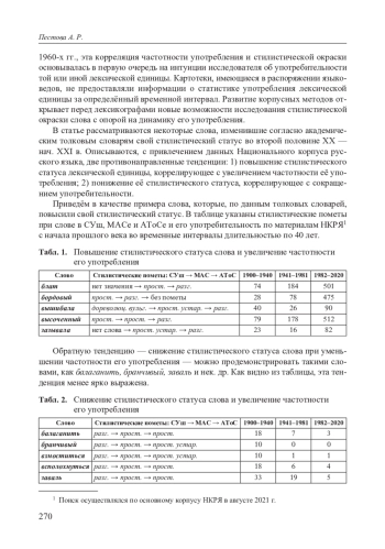 Д. Н. Шмелёв отмечал, что «… частое употребление стилистически окрашенных слов приводит к тому, что их стилистическая окраска перестает ощущаться говорящими и слушающими» [Шмелёв 2002: 243]. Верно и обратное: «При резком сокращении употребительности нейтральные слова уходили за пределы литературного языка, в просторечие» [Там же: 248]. Сформулированная учёным в конце 270 1960-х гг., эта корреляция частотности употребления и стилистической окраски основывалась в первую очередь на интуиции исследователя об употребительности той или иной лексической единицы. Картотеки, имеющиеся в распоряжении языковедов, не предоставляли информации о статистике употребления лексической единицы за определённый временной интервал. Развитие корпусных методов открывает перед лексикографами новые возможности исследования стилистической окраски слова с опорой на динамику его употребления.