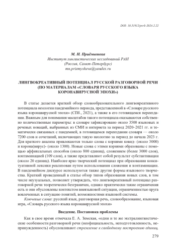 В статье делается краткий обзор словообразовательного лингвокреативного потенциала неологии пандемийного периода, представленной в «Словаре русского языка коронавирусной эпохи» (СПб., 2021), а также в его готовящемся переиздании. Важным для понимания масштабов такого потенциала оказываются собственно количественные параметры: в словаре зафиксировано около 3500 языковых и речевых новаций, выбранных из СМИ и интернета за период 2020–2021 гг. и тематически связанных с пандемией, в готовящемся переиздании словаря — около 7200 слов и сочетаний, включающих такую неологию за период до начала 2023 г. Для краткого анализа привлекаются только слова с корнями ковид- (около 3000) и корона(вирус)- (около 1300). Новые слова с этими корнями образованы с помощью аффиксальных способов (около 800 единиц), сложением (более 3000 слов), контаминацией (109 слов), а также представляют собой результат субстантивации (около 20 единиц). Наиболее ярко творческий потенциал при образовании конситуативной лексики реализован путем использования сложения и контаминации. В пандемийном дискурсе используются также другие формы языкового творчества. Краткий проведенный в статье обзор типов образования новых слов, в том числе неузуальных, позволяет утверждать, что лингвокреативный потенциал разговорной речи теоретически безграничен, однако практически такие ограничения есть и они обусловлены контекстом внеязыковой ситуации, ограниченностью круга вовлеченных в ситуацию понятий, возможностями языковой системы
