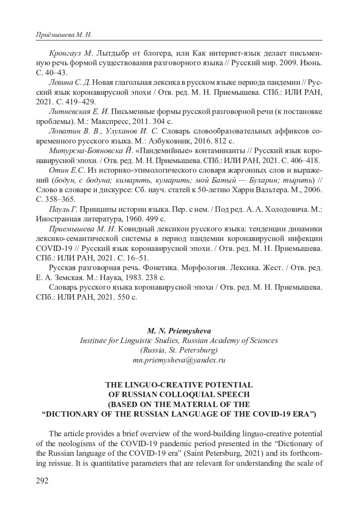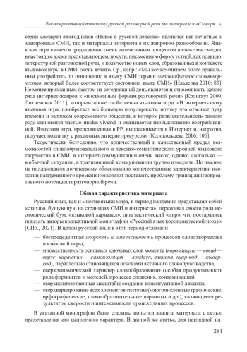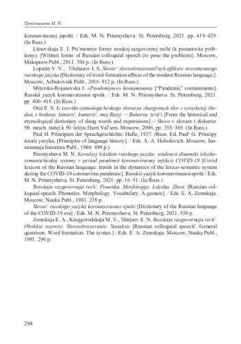 14. Приемышева М. Н. Ковидный лексикон русского языка: тенденции динамики лексико-семантической системы в период пандемии коронавирусной инфекции COVID-19 // Русский язык коронавирусной эпохи. / Отв. ред. М. Н. Приемышева. СПб.: ИЛИ РАН, 2021. С. 16-51. EDN: OABBLD