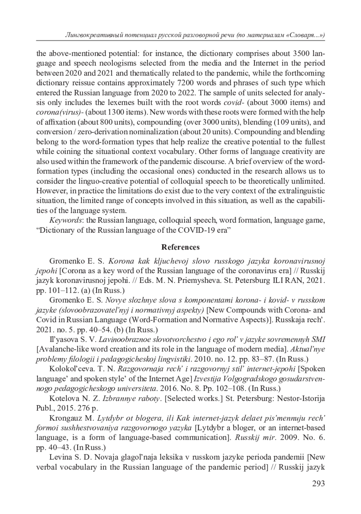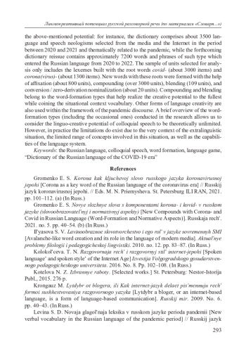 1. Громенко Е. C. Новые сложные слова с компонентами корона- и ковид- в русском языке (словообразовательный и нормативный аспекты) // Русская речь. 2021. № 5. С. 40-54. (а). EDN: EPFPWJ