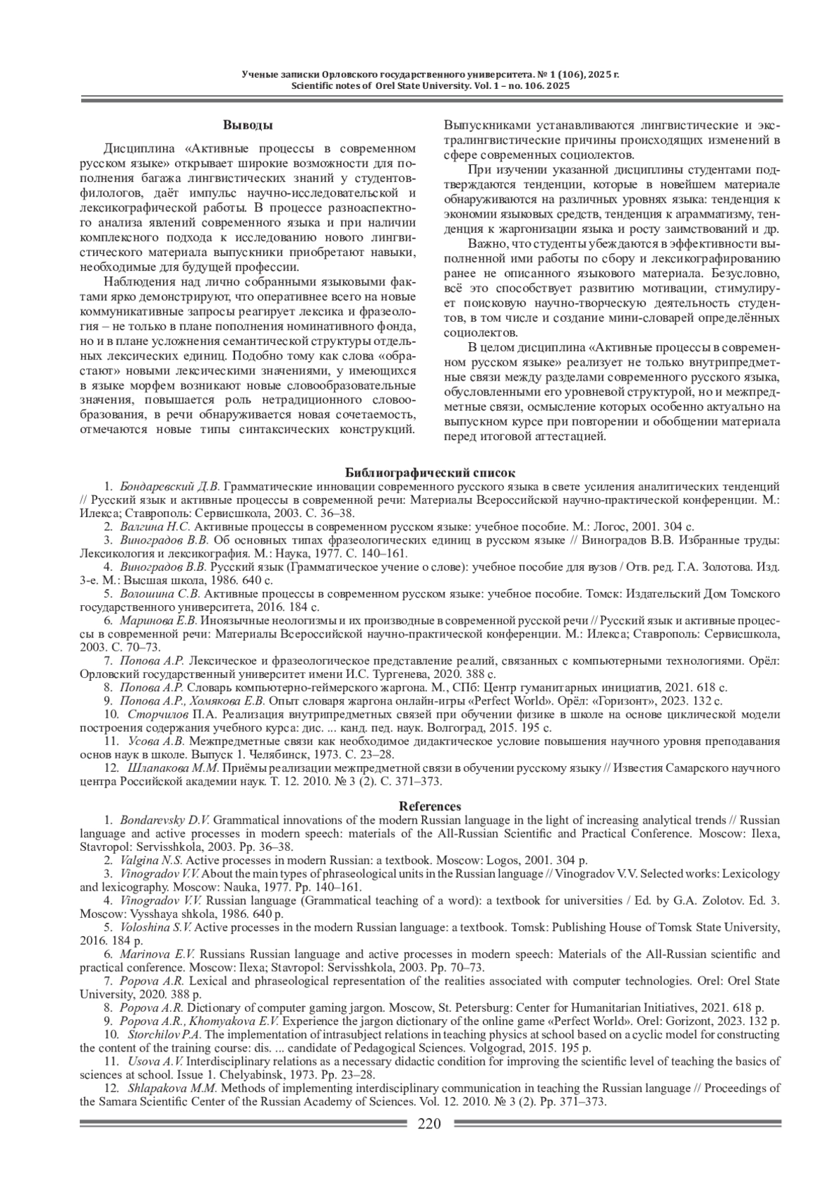 1. Бондаревский Д.В. Грамматические инновации современного русского языка в свете усиления аналитических тенденций // Русский язык и активные процессы в современной речи: Материалы Всероссийской научно-практической конференции. М.: Илекса; Ставрополь: Сервисшкола, 2003. С. 36-38.