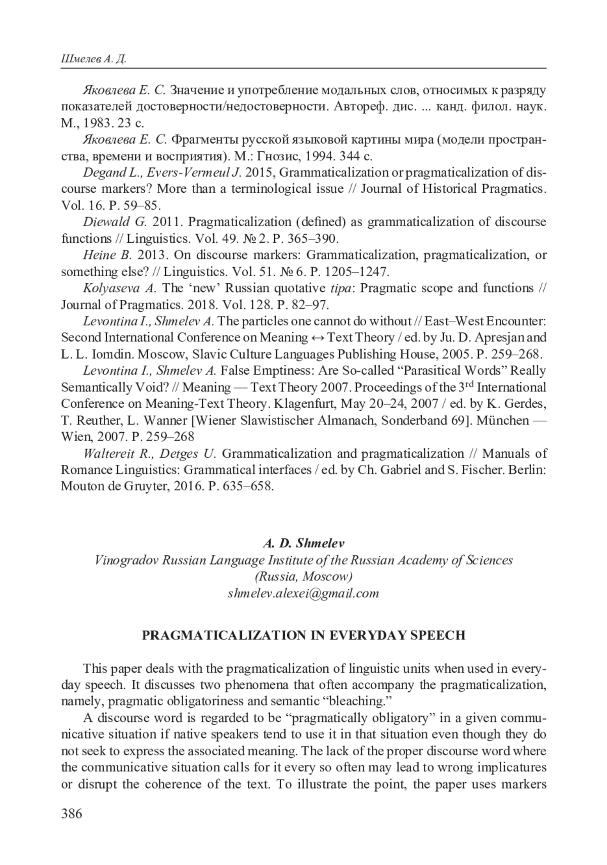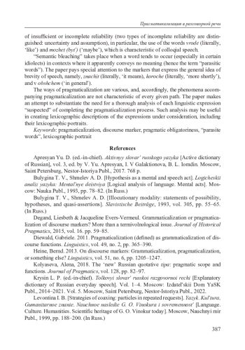 18. Diewald G. 2011. Pragmaticalization (defined) as grammaticalization of discourse functions // Linguistics. Vol. 49. № 2. P. 365-390.