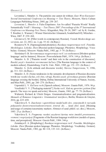 22. Levontina I., Shmelev A. False Emptiness: Are So-called “Parasitical Words” Really Semantically Void? // Meaning - Text Theory 2007. Proceedings of the 3rd International Conference on Meaning-Text Theory. Klagenfurt, May 20-24, 2007 / ed. by K. Gerdes, T. Reuther, L. Wanner [Wiener Slawistischer Almanach, Sonderband 69]. München - Wien, 2007. P. 259-268.