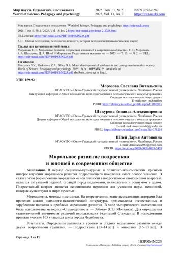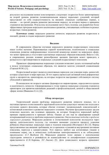 В современном обществе изучения морального развития подрастающего поколения имеет особое значение. Переживаемые страной экономические, политические и социальные изменения, развитие информационных технологий неминуемо влияют на моральную сферу, что может приводить к отсутствию однозначных моральных образцов поведения.