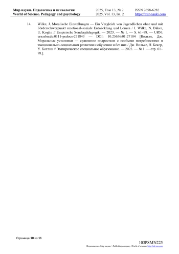 14. Wilke, J. Moralische Einstellungen - Ein Vergleich von Jugendlichen ohne und mit Förderschwerpunkt emotional-soziale Entwicklung und Lernen / J. Wilke, N. Bäker, U. Koglin // Empirische Sonderpädagogik. - 2023. - № 1. - S. 61-78. - URN: urn:nbn:de:0111-pedocs-271843 - DOI: 10.25656/01:27184 [Вильке, Дж. Моральные установки - сравнение подростков с особыми потребностями в эмоционально-социальном развитии и обучении и без них / Дж. Вильке, Н. Бекер, У. Коглин // Эмпирическое специальное образование. - 2023. - № 1. - стр. 61-78.].
