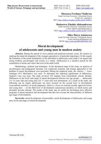 Результаты. Определены различия в уровнях и стадиях морального развития между двумя возрастными группами, - подростками (13-14 лет) и юношами (16-17 лет). В результате исследования можно констатировать следующее: подростки более ориентированы на второй уровень развития (конвенциональная мораль) моральных суждений, который представляет из себя сосредоточенность на внешних социально одобряемых нормах, а юноши - на третий уровень развития (автономная мораль), на котором нормы и принципы становятся внутренними. Результаты исследования могут быть полезны для разработки более эффективных программ морального воспитания и развития, учитывающих особенности разных возрастных этапов развития.