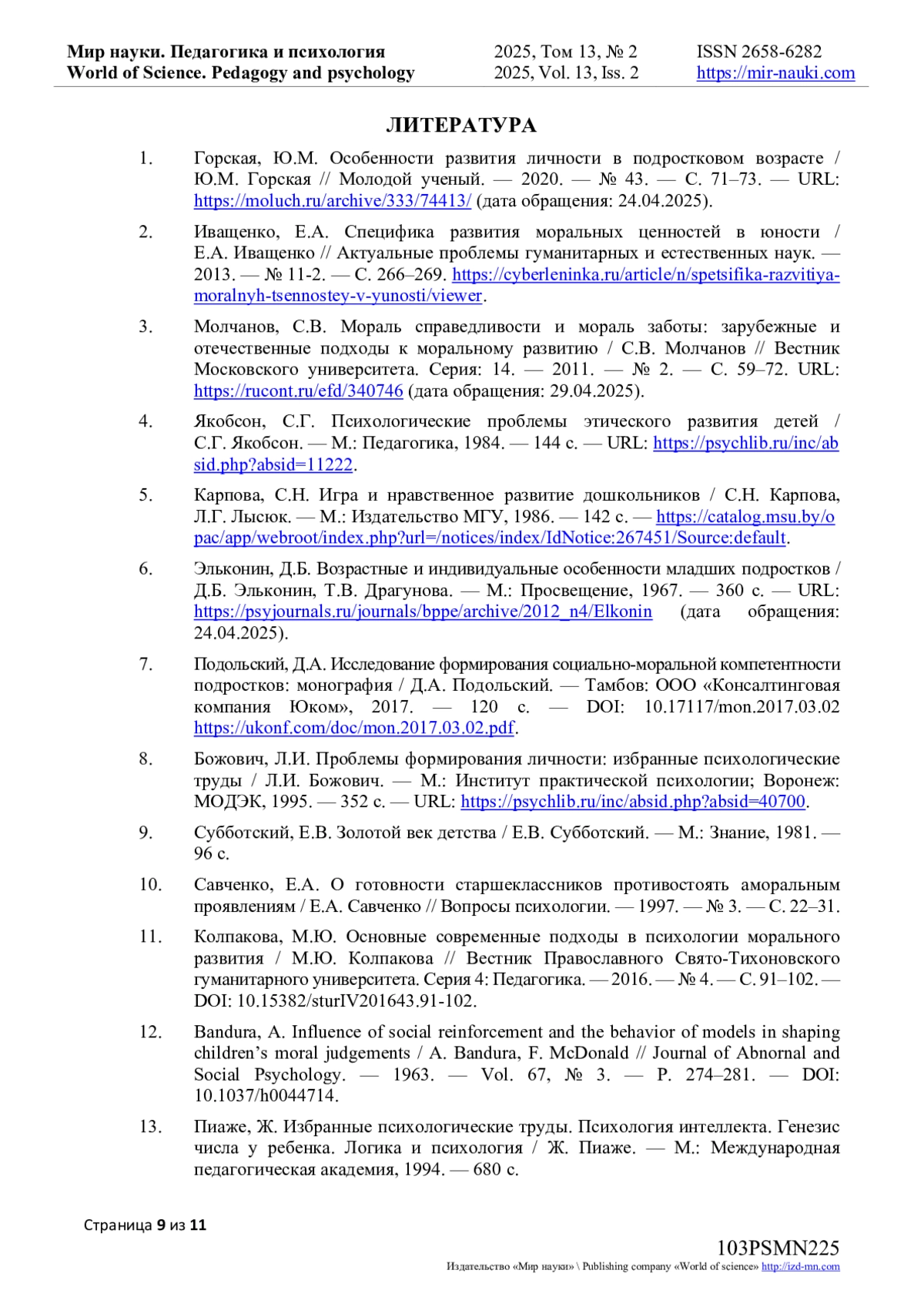 11. Колпакова, М.Ю. Основные современные подходы в психологии морального развития / М.Ю. Колпакова // Вестник Православного Свято-Тихоновского гуманитарного университета. Серия 4: Педагогика. - 2016. - № 4. - С. 91-102. -. DOI: 10.15382/sturIV201643.91-102