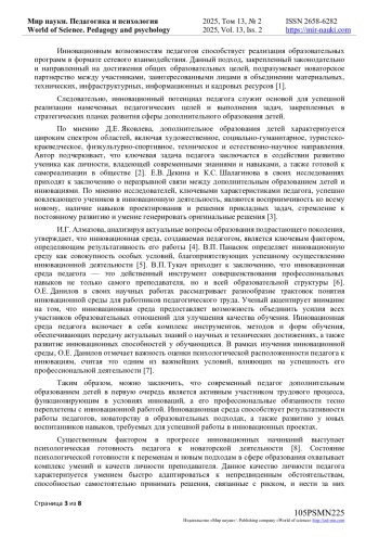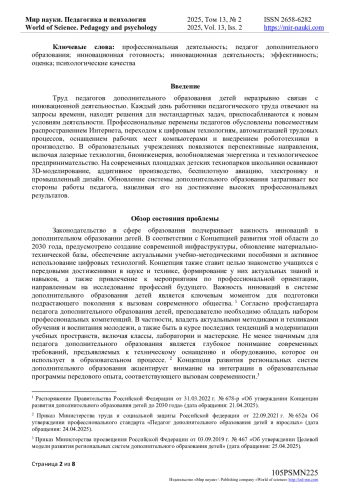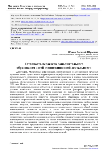 Масштабная цифровизация, интернетизация и автоматизация трудовых процессов вносят существенные корректировки в профессиональную деятельность педагогов дополнительного образования детей. Инновационные изменения в системе дополнительного образования детей закреплены на законодательном уровне, что подтверждается целями и задачами, обозначенными в Концепции развития дополнительного образования детей до 2030 года. Педагог, являясь наставником и проводником подрастающего поколения в мир профессий выступает, главным субъектом, от которого зависит их всестороннее развитие. В условиях глобальных технологических изменений важным фактором эффективности профессиональной деятельности педагога выступает его психологическая готовность к инновационной деятельности.