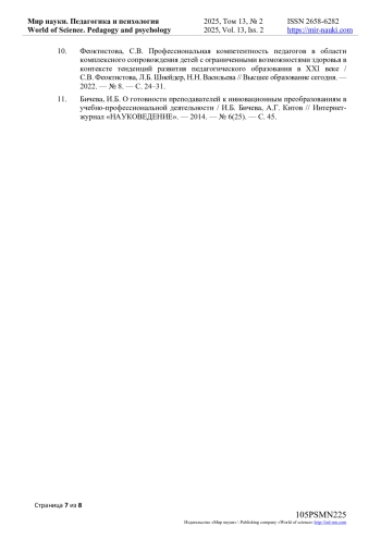 10. Феоктистова, С.В. Профессиональная компетентность педагогов в области комплексного сопровождения детей с ограниченными возможностями здоровья в контексте тенденций развития педагогического образования в XXI веке / С.В. Феоктистова, Л.Б. Шнейдер, Н.Н. Васильева // Высшее образование сегодня. - 2022. - № 8. - С. 24-31. EDN: HDCZSO