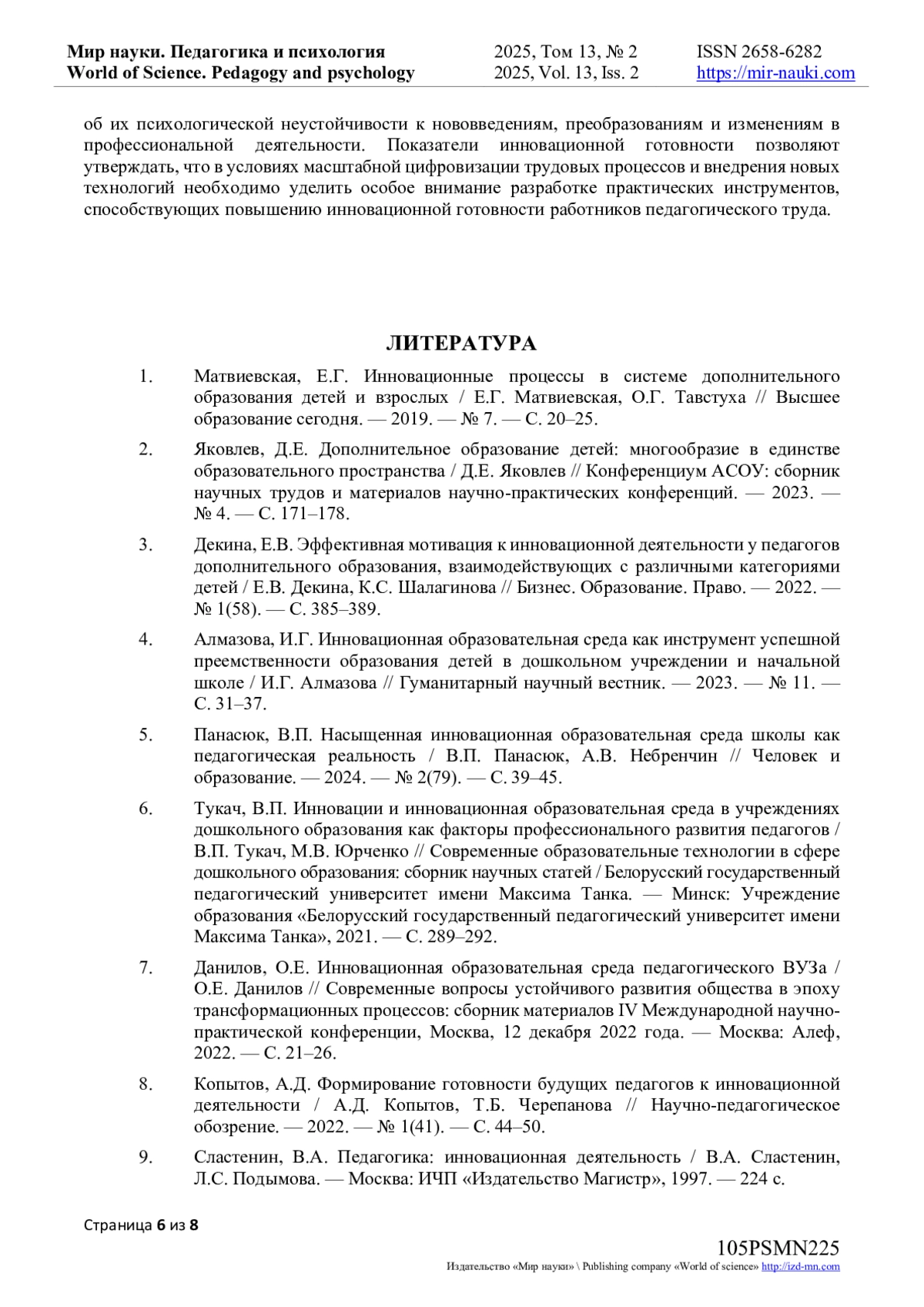 8. Копытов, А.Д. Формирование готовности будущих педагогов к инновационной деятельности / А.Д. Копытов, Т.Б. Черепанова // Научно-педагогическое обозрение. - 2022. - № 1(41). - С. 44-50. EDN: MAHZPP