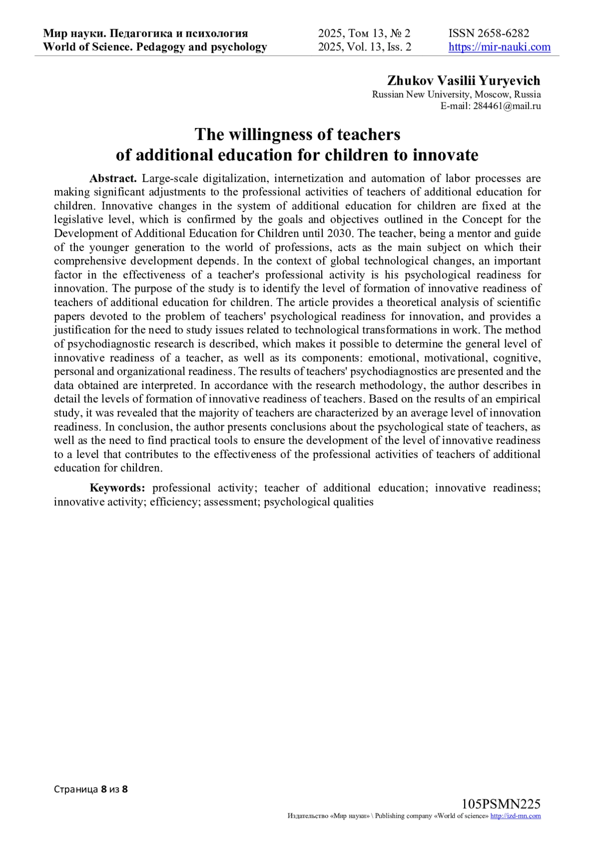 В заключении автором представлены выводы о психологическом состоянии педагогов, а также необходимости поиска практических инструментов, обеспечивающих развитие уровня инновационной готовности до уровня, способствующего эффективности профессиональной деятельности педагогов дополнительного образования детей.