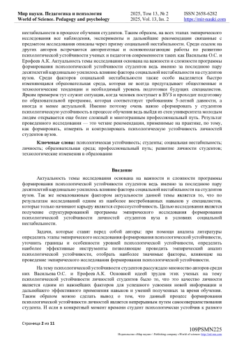 В статье приведены основные вехи процесса исследования формирования психологической устойчивости студентов вуза. Авторы предоставляют структурированный и последовательный цикл действий позволяющих достичь высокую степень определенности в вопросе понимания формирования психологической устойчивости студентов. В рамках описанной статьи особое внимание уделяется конкретно наличию фактора социальной нестабильности в процессе обучения студентов. Таким образом, на всех этапах эмпирического исследования все наблюдения, эксперименты и дальнейшие рекомендации связанные с предметом исследования описаны через призму социальной нестабильности. Среди ссылок на других авторов встречаются авторитетные и основополагающие работы по развитию психологической устойчивости ученых и педагогов современности таких как Васильева О. С. и Ерофеев А. К. Актуальность темы исследования основана на важности и сложности программы формирования психологической устойчивости студентов ведь именно за последнюю пару десятилетий кардинально усилилось влияние фактора социальной нестабильности на студентов вузов. Среди факторов социальной нестабильности также особо выделяется быстро изменяющаяся образовательная среда, которая не всегда предугадывает общественные и технологические тенденции и необходимый уровень подготовки будущих специалистов. Ярким примером тут служит ситуация, когда человек поступает в ВУЗ и проходит подготовку по образовательной программе, которая соответствует требованиям 5-летней давности, а иногда и менее актуальной. Именно поэтому очень важно сформировать у студентов психологическую устойчивость в процессе обучения ведь выйдя из стен университета молодым людям открывается еще более сложный и многогранным профессиональный путь.