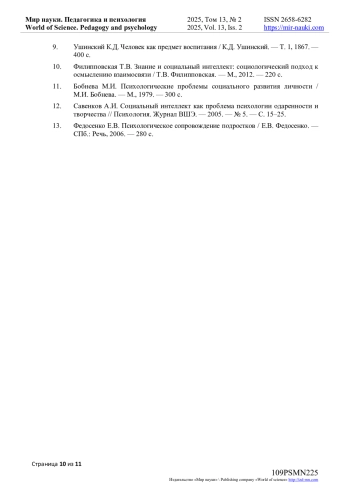 12. Савенков А.И. Социальный интеллект как проблема психологии одаренности и творчества // Психология. Журнал ВШЭ. - 2005. - № 5. - С. 15-25. EDN: JWMBEV