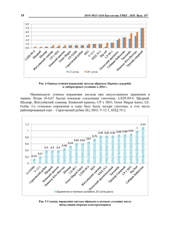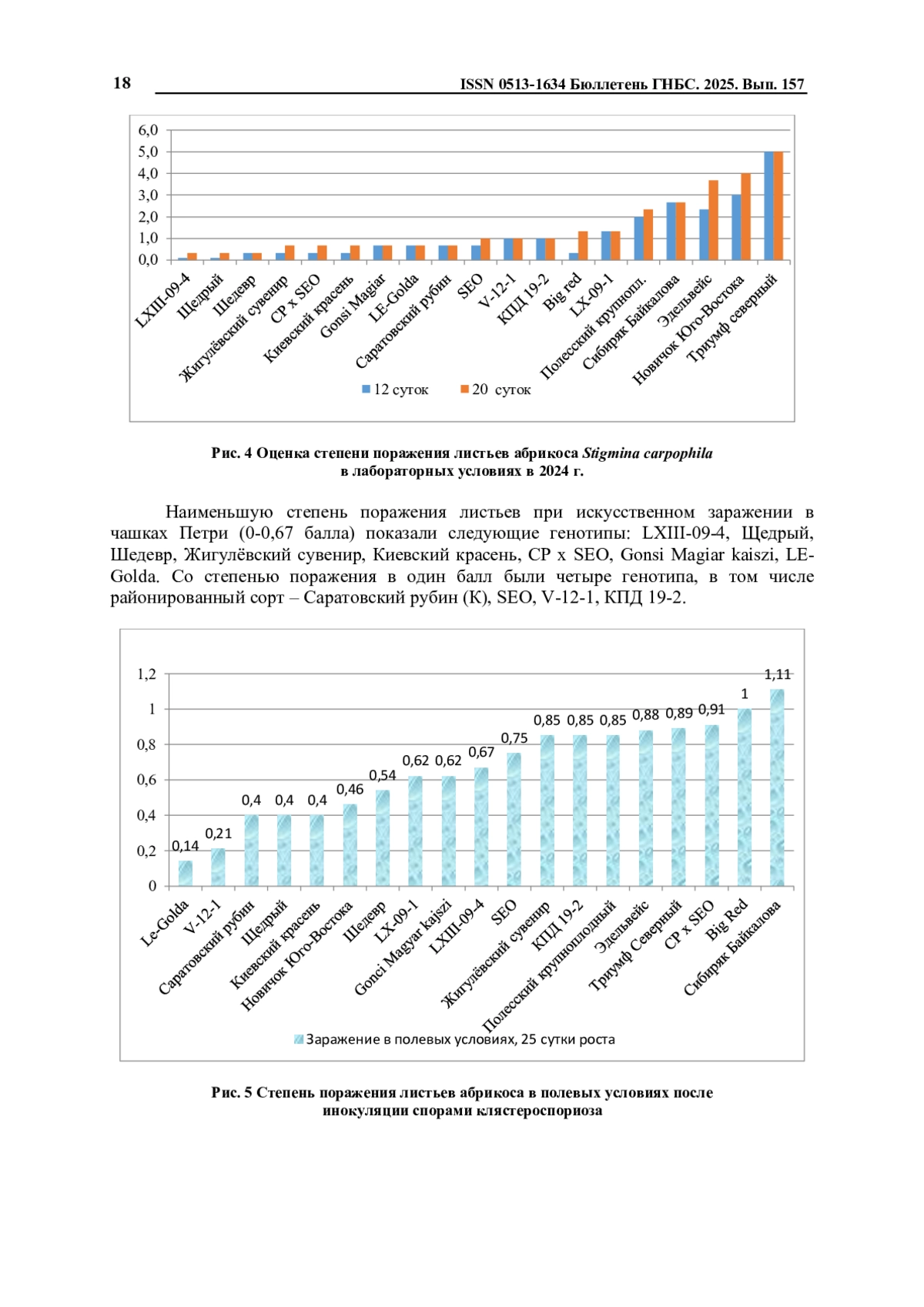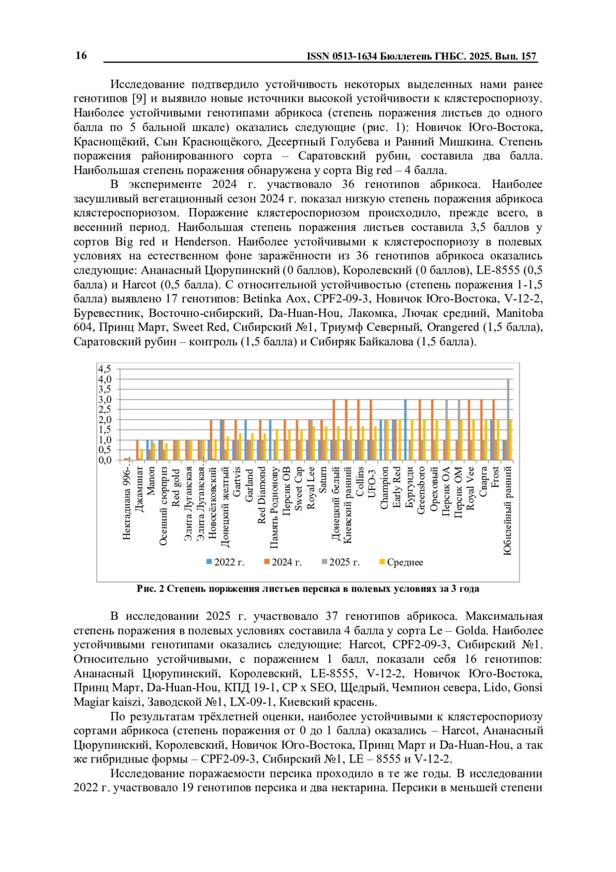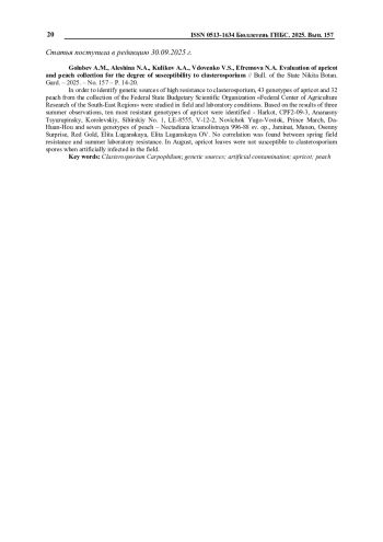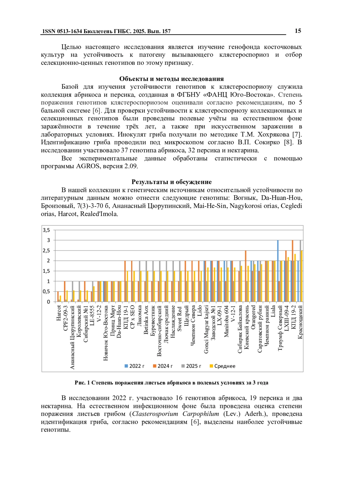С целью выявления генетических источников высокой устойчивости к клястероспориозу, в полевых и лабораторных условиях, изучалось 37 генотипов абрикоса и 32 персикаколлекции ФГБНУ «ФАНЦ Юго-Востока». По результатам трёхлетних наблюдений выделено десять наиболее устойчивых генотипов абрикоса – Harcot, CPF2-09-3, Ананасный Цюрупинский, Королевский, Сибирский № 1, LE-8555, V-12-2, Новичок Юго-Востока, Принц март, Da-Huan-Hou и семь генотипов персика – Нектадиана краснолистная 996-88 св. оп., Джаминат, Manon, Осенний сюрприз, Red gold, Элита Луганская, Элита Луганская ОВ. Не выявлено корреляции весенней полевой устойчивости и летней лабораторной. В августе листья абрикоса были не восприимчивы к спорам клястероспориоза при искусственном заражении в полевых условиях.