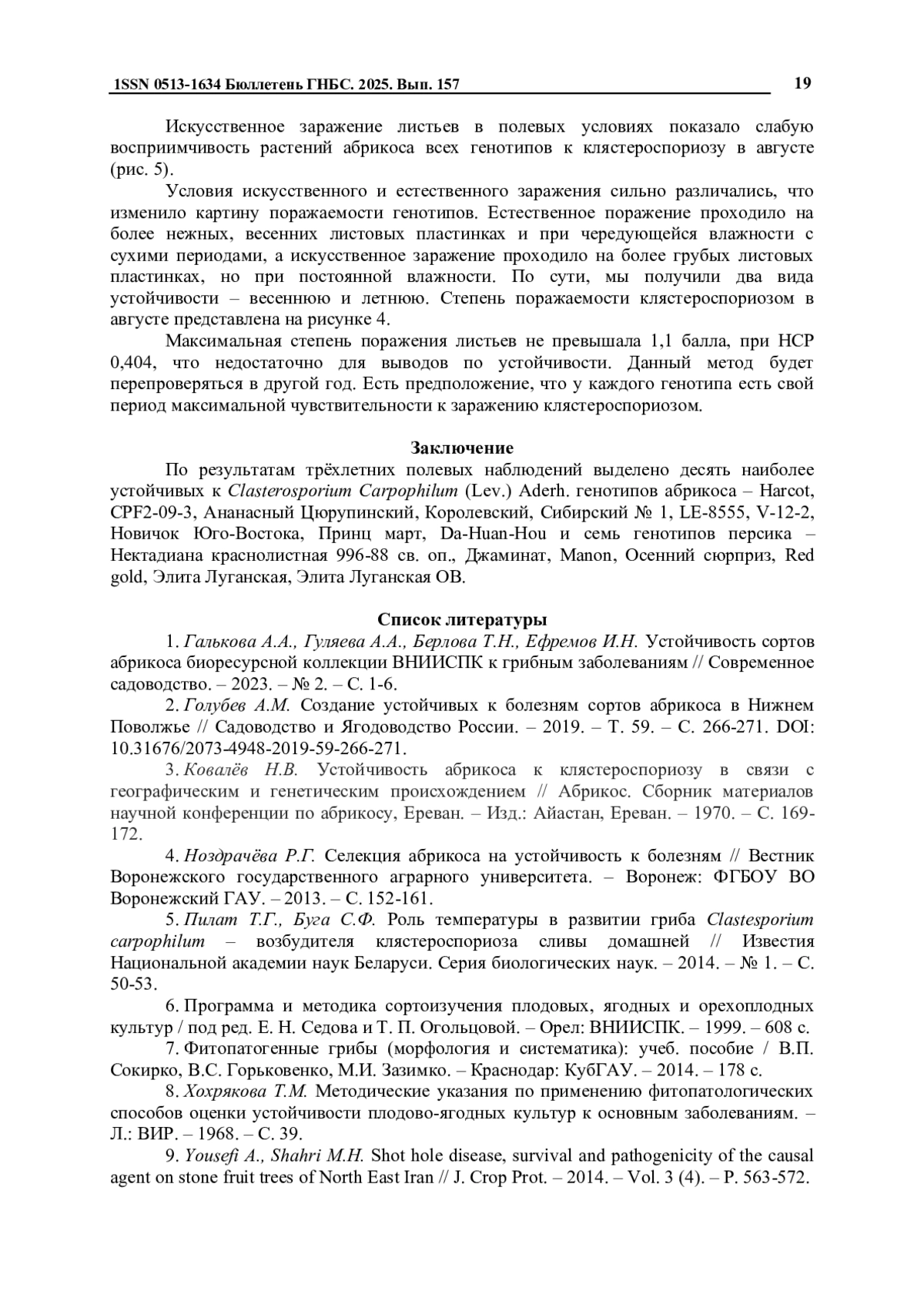 1. Галькова А.А., Гуляева А.А., Берлова Т.Н., Ефремов И.Н. Устойчивость сортов абрикоса биоресурсной коллекции ВНИИСПК к грибным заболеваниям // Современное садоводство. - 2023. - № 2. - С. 1-6.