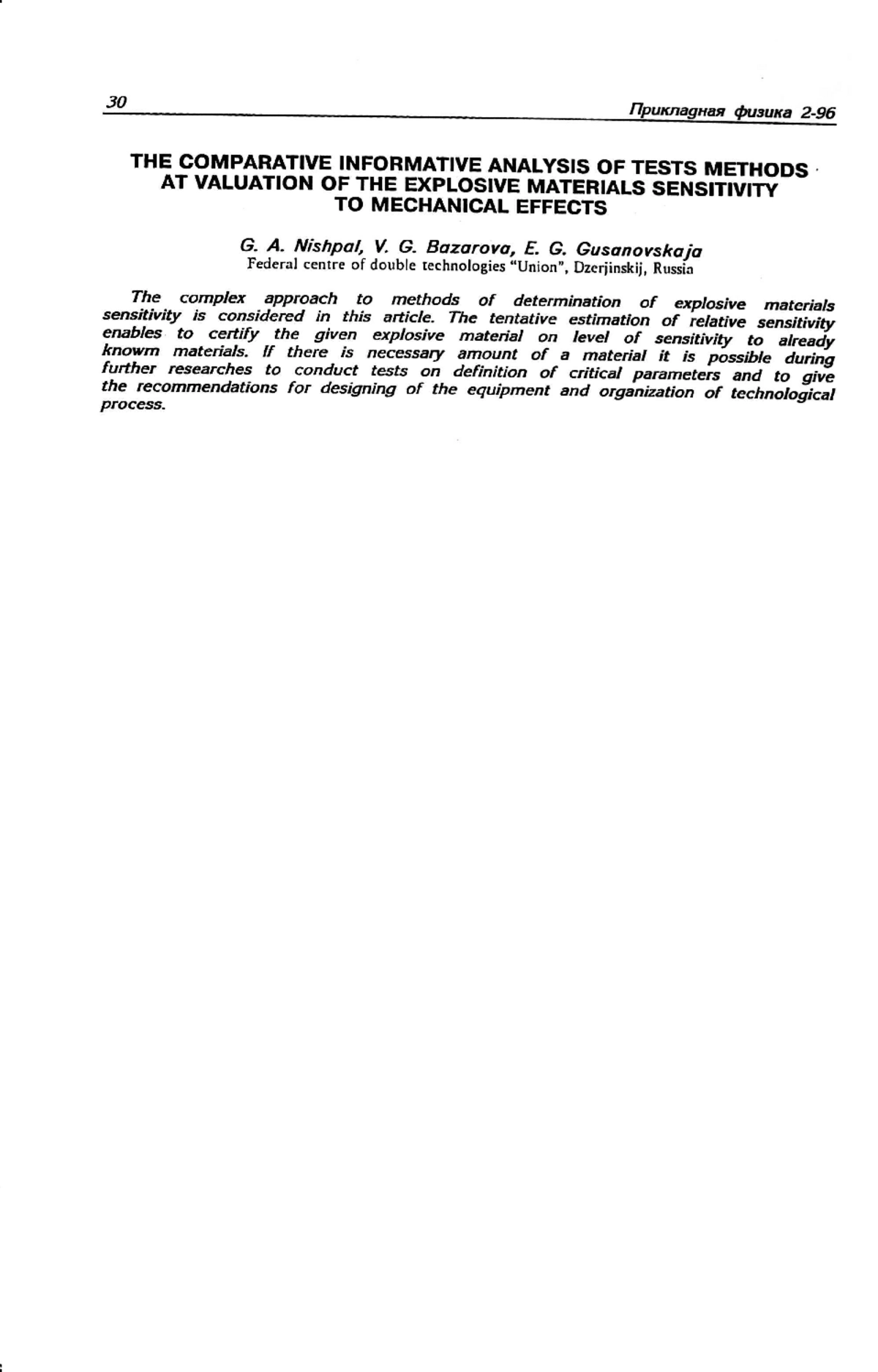 Рассмотрен комплексный подход к методам определения чувствительности взрывчатых материалов (ВМ). Предварительная оценка относительной чувствительности дает возможность аттестовать данный взрывчатый материал по уровню чувствительности к уже известным материалам. При наличии необходимого количества материала можно в ходе дальнейших исследований провести испытания по определению критических параметров и дать рекомендации по проектированию оборудования и организации технологического процесса