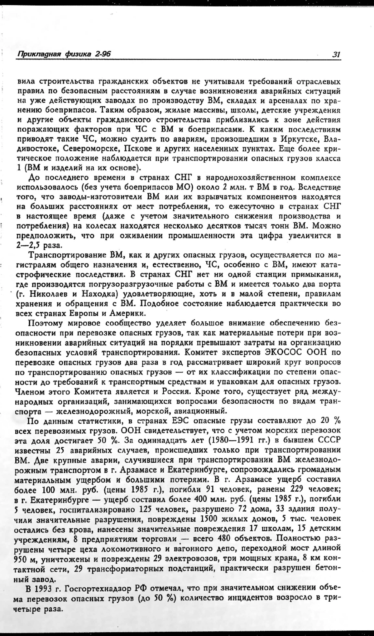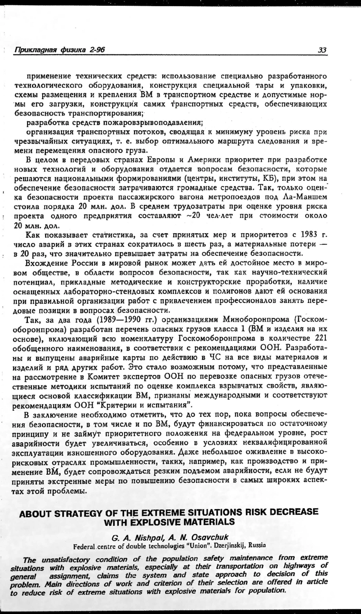 Неудовлетворительное состояние обеспечения безопасности населения от чрезвычайных ситуаций с взрывчатыми материалами (ВМ), особенно при их транспортировке по магистралям общего назначения, требует системного и государственного подхода к решению этой проблемы. В статье предложены основные направления работ и критерий их отбора, позволяющие снизить риск чрезвычайных ситуаций ВМ для населения