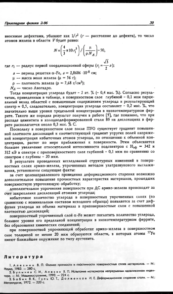 Методом мессбауэровской спектроскопии исследованы структурные изменения в приповерхностных слоях армко-железа в процессе деформационного старения после упрочнения способом ультразвукового выглаживания. Показано, что при поверхностной упрочняющей обработке армко-железа в поверхностном слое толщиной не менее 20 мкм образуются области, в которых атомы 57Fe имеют ближайшее окружение по типу аустенита. В результате последующего деформационного старения происходит диффузионное перераспределение углерода из объема материала в поверхностный слой с повышенной плотностью дислокаций
