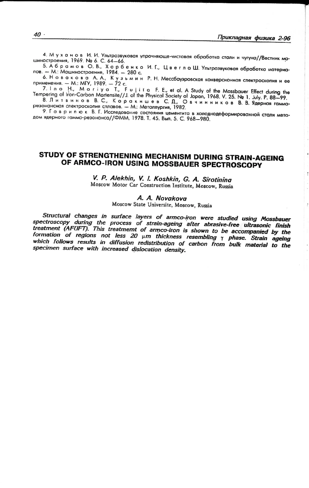 Structural changes in surface layers of armco-iron were studied using Mossbauer spectroscopy during the process of strain-ageing after abrasive-free ultrasonic finish treatment (AFUFT). This treatment of armco-iron is shown to be accompanied by the formation of regions not less 20 µm thickness resembling γ phase. Strain ageing which follows results in diffusion redistribution of carbon from bulk material to the specimen surface with increased dislocation density