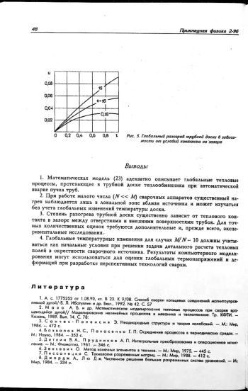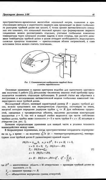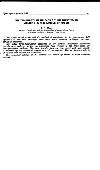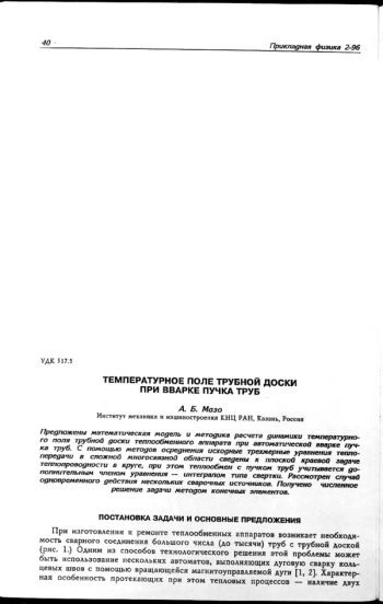 Предложены математическая модель и методика расчета динамики температурного поля трубной доски теплообменного аппарата при автоматической вварке пучка труб. С помощью методов осреднения исходные трехмерные уравнения теплопередачи в сложной многосвязной области сведены к плоской краевой задаче теплопроводности в круге, при этом теплообмен с пучком труб учитывается дополнительным членом уравнения — интегралом типа свертки. Рассмотрен случай одновременного действия нескольких сварочных источников. Получено численное решение задачи методом конечных элементов