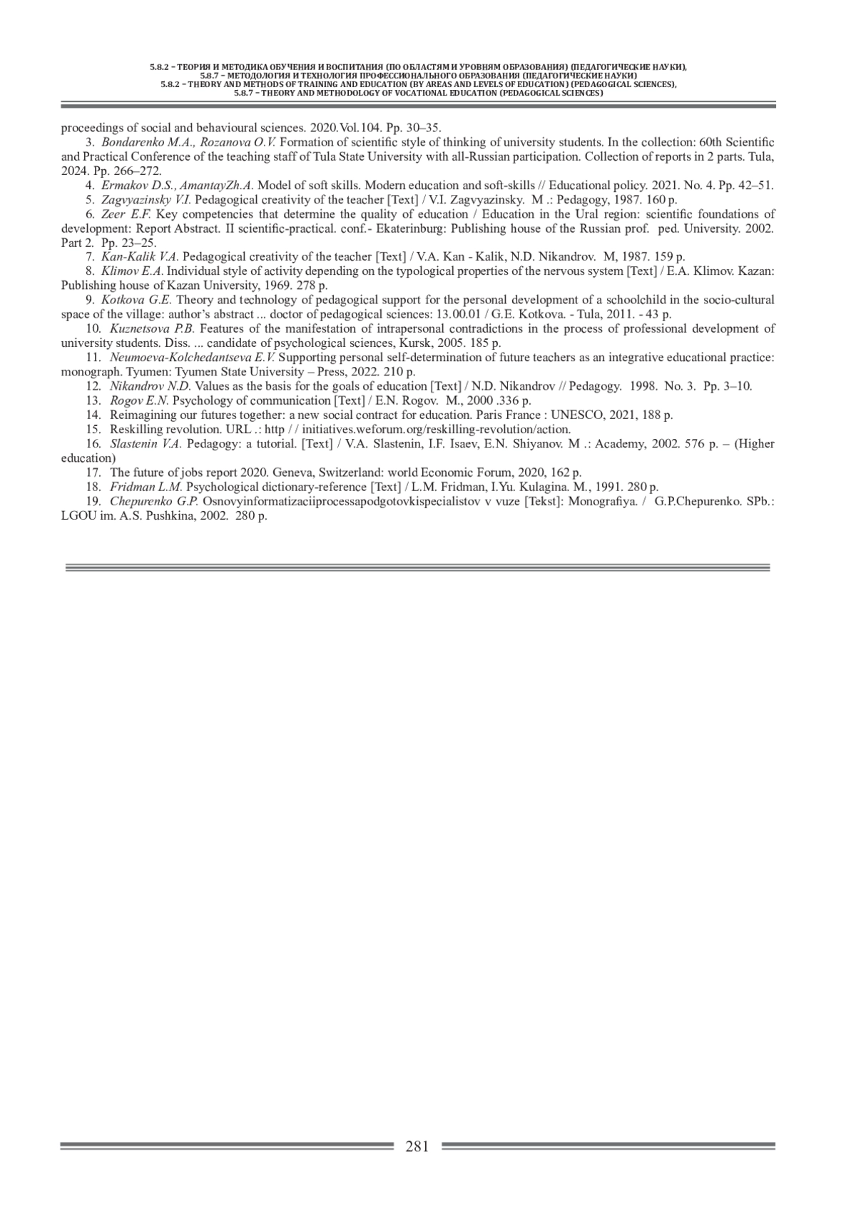 3. Бондаренко М.А., Розанова О.В. Формирование научного стиля мышления студентов вуза. В сборнике: 60-я Научнопрактическая конференция профессорско-преподавательского состава ТулГУ с всероссийским участием. Сборник докладов в 2-х частях. Тула, 2024. С. 266-272. EDN: LUNSCQ